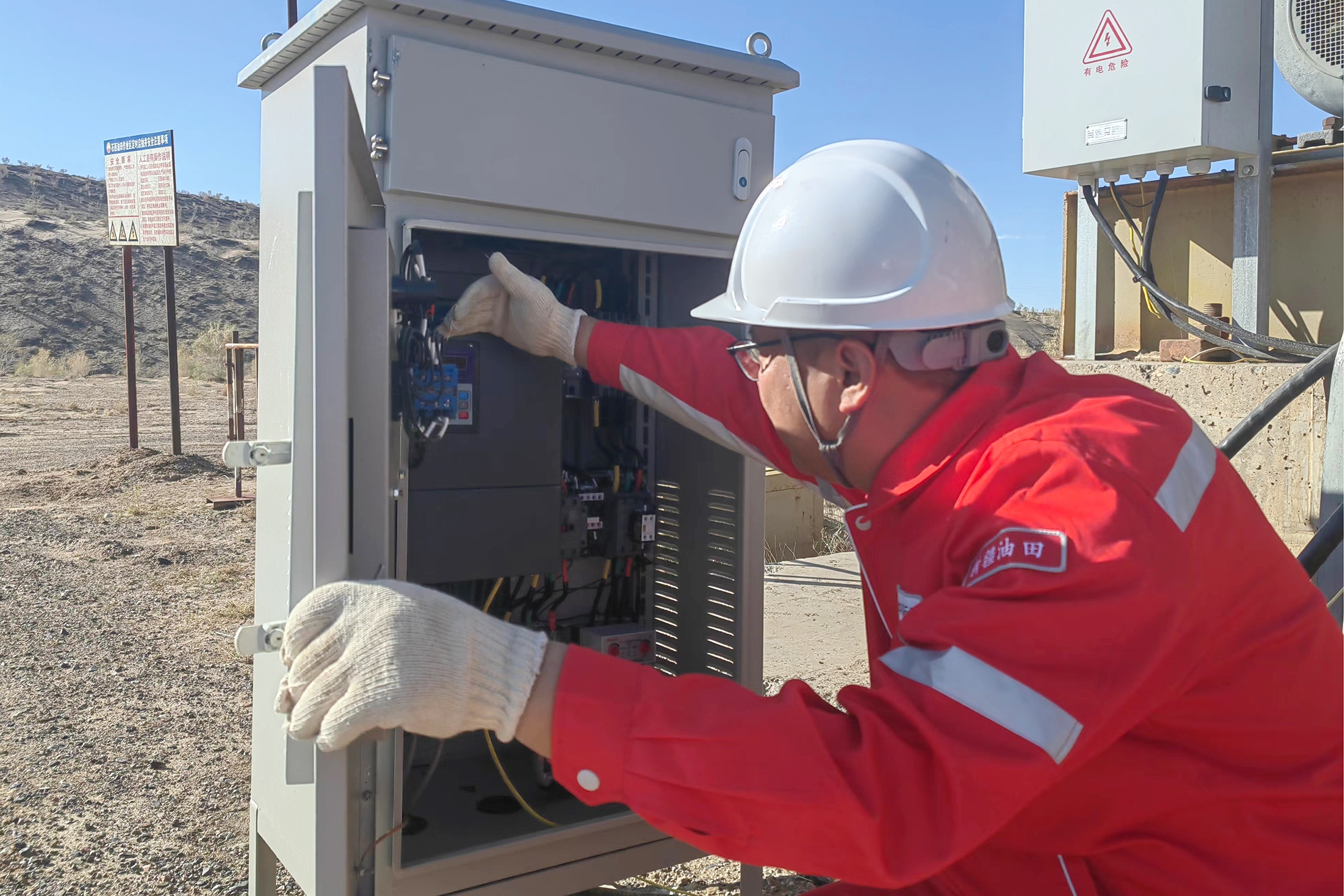 2024年9月,石西油田作业区采油管理人员罗吉正在检查新安装的智能间抽控制柜的运行状况。克拉玛依融媒通讯员 白会彦 摄