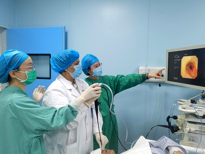 2024年12月25日,巴基斯坦进修医生拉齐·古拉特·尤利·艾恩(中)在自治区人民医院克拉玛依医院﹤市中心医院﹥呼吸科带教医生的指导下做支气管镜检查。(图片由自治区人民医院克拉玛依医院﹤市中心医院﹥提供)