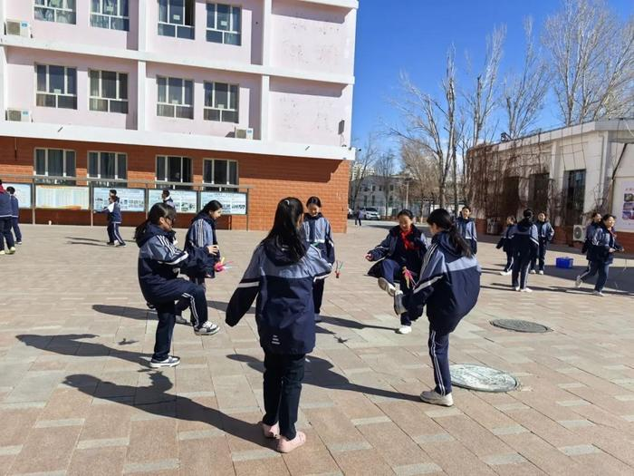 市第二中学学生在教学楼前广场上踢毽子。(图片由市第二中学提供)