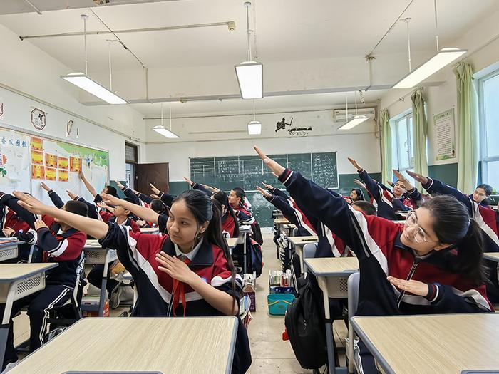 “跳跳舞整个人都精神了,下一节课注意力也更集中。”学生们一边伸展手臂,一边笑着说道。阳光透过窗户洒在他们青春洋溢的脸庞上,教室仿佛变成了一个迷你舞台。