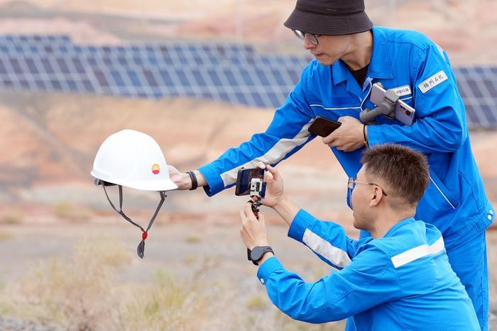 9月23日,锦州石化公司党委宣传部参赛选手在新疆油田三三区光伏基地拍摄短视频。新疆石油报记者 蒋剑 摄