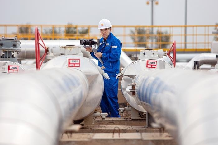 巨大的储气井与注气设备排列整齐,注气管道上标注着醒目的介质流向标识,压缩机运转时发出低沉的轰鸣,将天然气加压注入地下储气库……新疆油田储气库用严谨与坚守守护着“能源粮仓”的安全。
