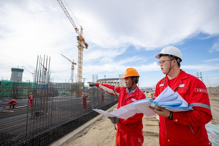 10月2日,煤电联营项目部碳捕集PMT工程技术团队在冷却塔施工现场讨论施工方案。新疆石油报记者 徐志远 摄