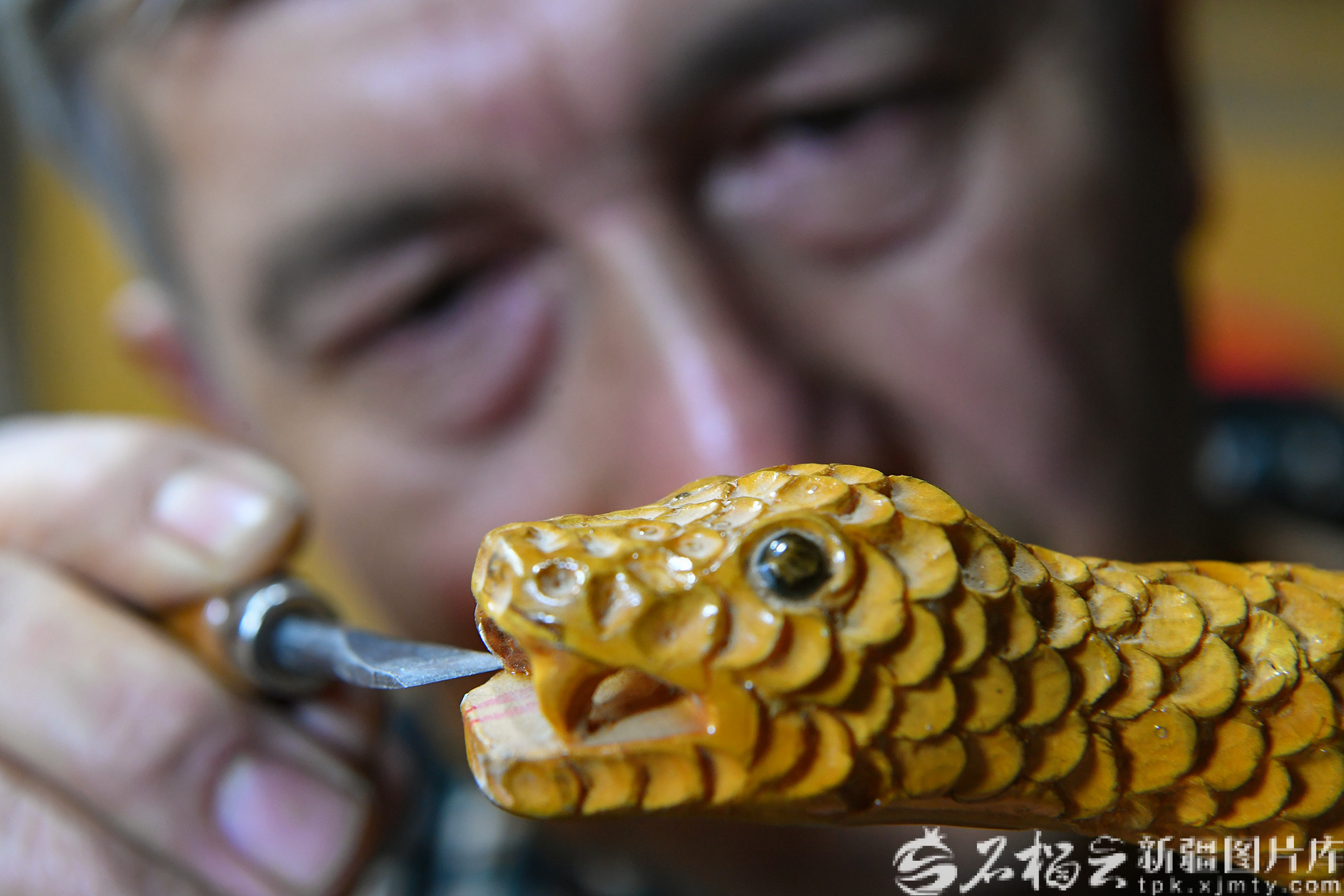 一段木头在艾尼江的精雕细琢下,似乎有了生命(12月1日摄)。