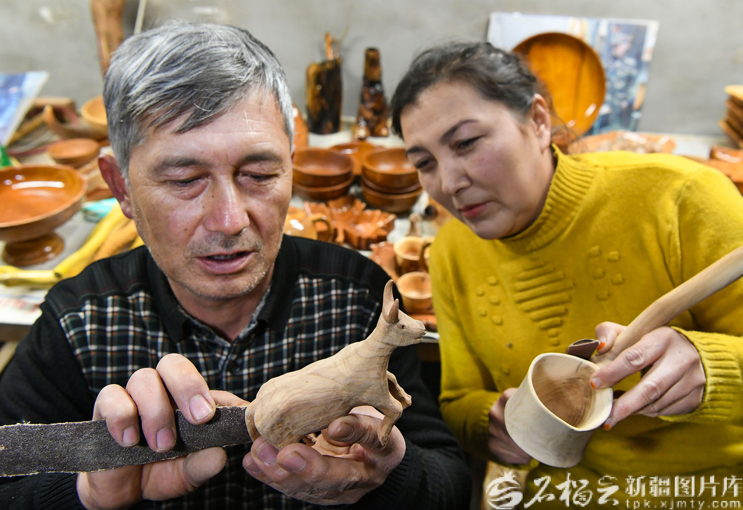 12月1日,艾尼江在工作室和妻子一起制作木雕作品。