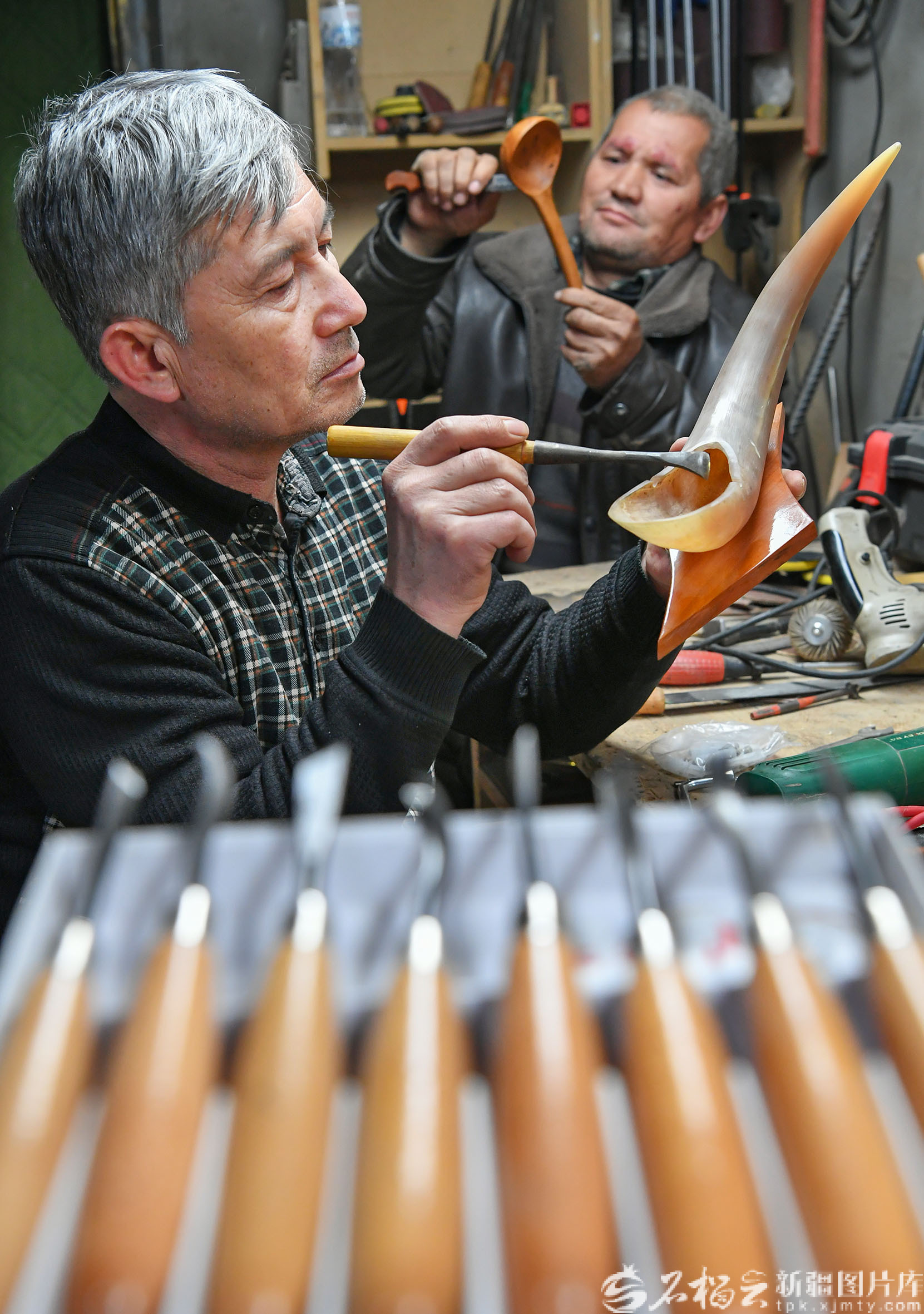 12月1日,艾尼江在工作室和徒弟一起制作牦牛角雕刻作品。