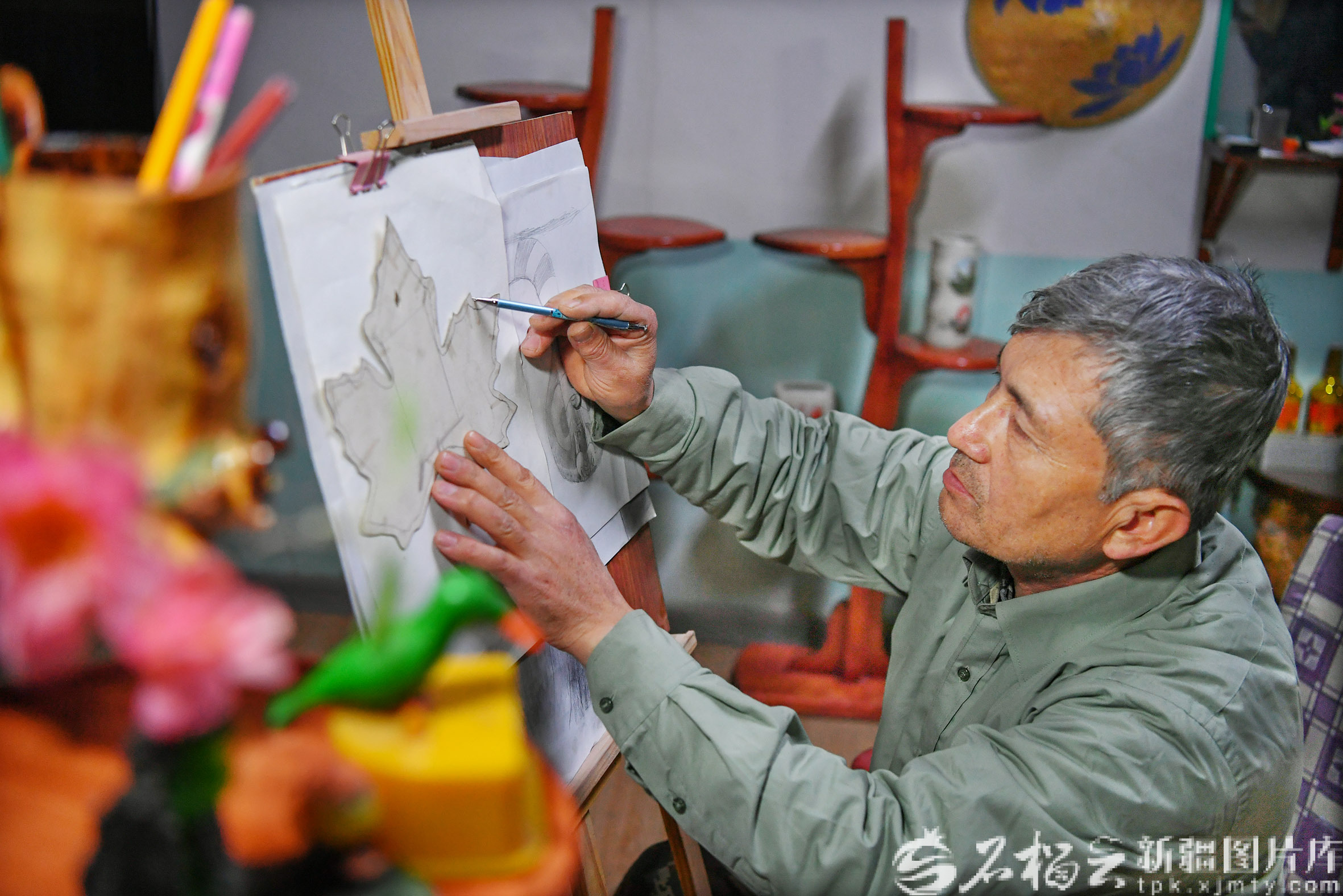 12月1日,艾尼江在绘制树叶形状的木雕果盘图纸。