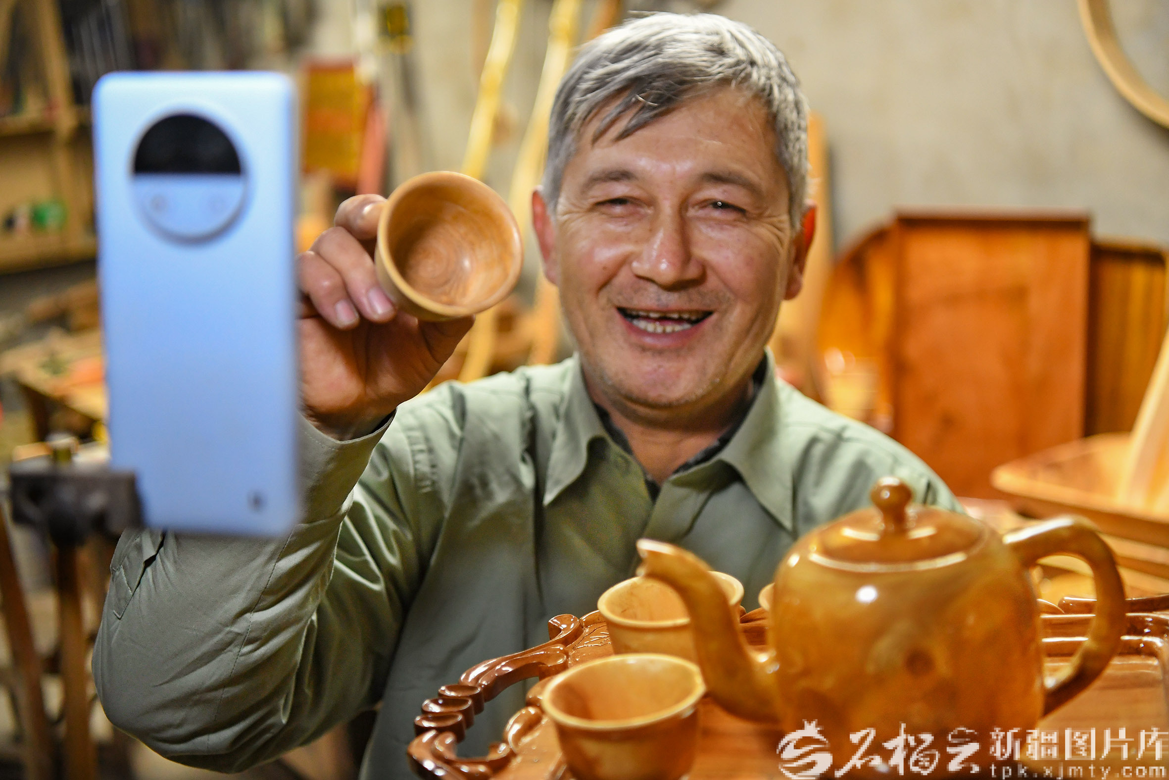 12月1日,艾尼江通过抖音平台介绍自己制作的木雕茶具。