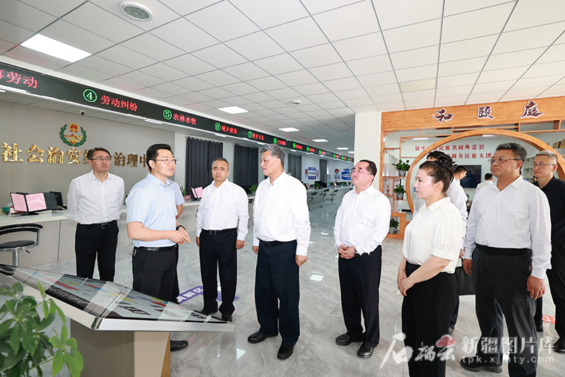5月25日,自治区党委书记、兵团党委第一书记、第一政委马兴瑞,自治区党委副书记、自治区主席艾尔肯·吐尼亚孜在新和县社会治安综治中心,了解各项工作开展情况。石榴云/新疆日报记者 崔志坚摄