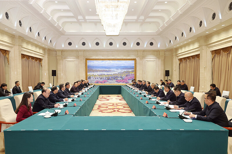 11月20日,自治区党委书记陈小江、自治区主席艾尔肯·吐尼亚孜在乌鲁木齐会见水利部党组书记、部长李国英一行。天山网-新疆日报记者 崔志坚摄