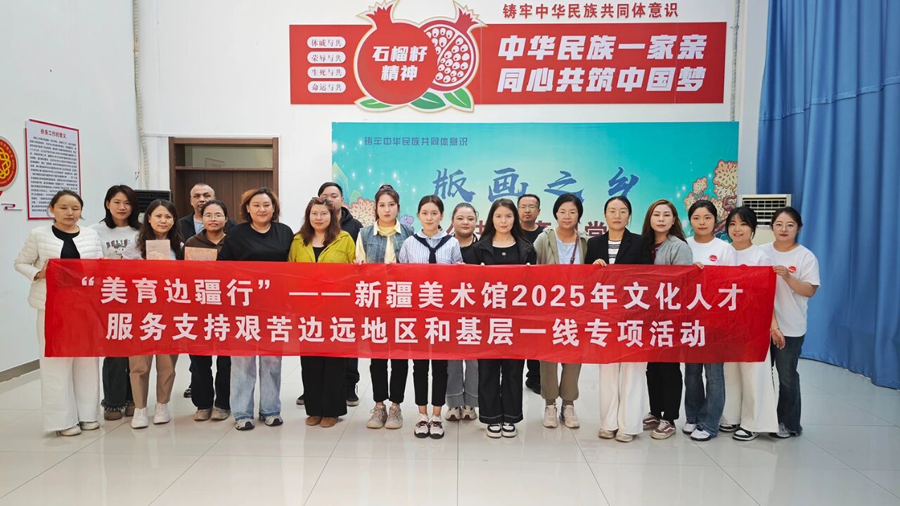 新疆美术馆文化和旅游志愿服务团队在白碱滩区艺术培训现场合影。(图片据白碱滩零距离公众号)