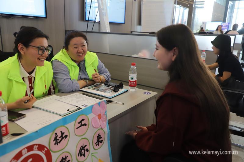 招聘会上,企业代表与求职者交流。(图片由克拉玛依市人社局提供)