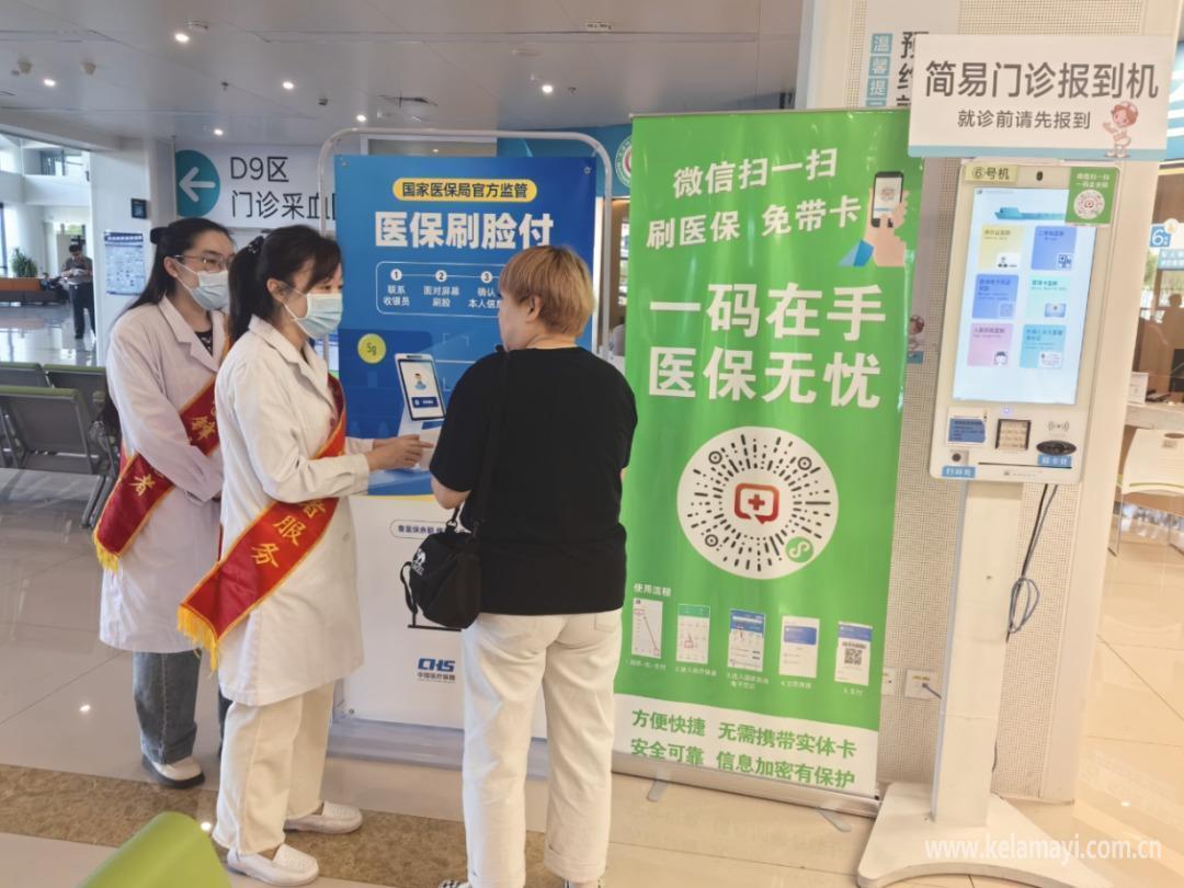 自治区人民医院克拉玛依医院(市中心医院)工作人员为患者讲解“刷脸”支付、刷码支付。