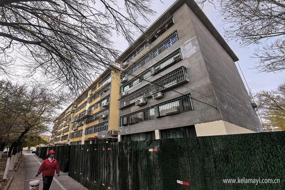 2025年11月3日,工人在克拉玛依区前进小区安装居民楼外墙外保温材料。克拉依融媒记者 闵勇 摄