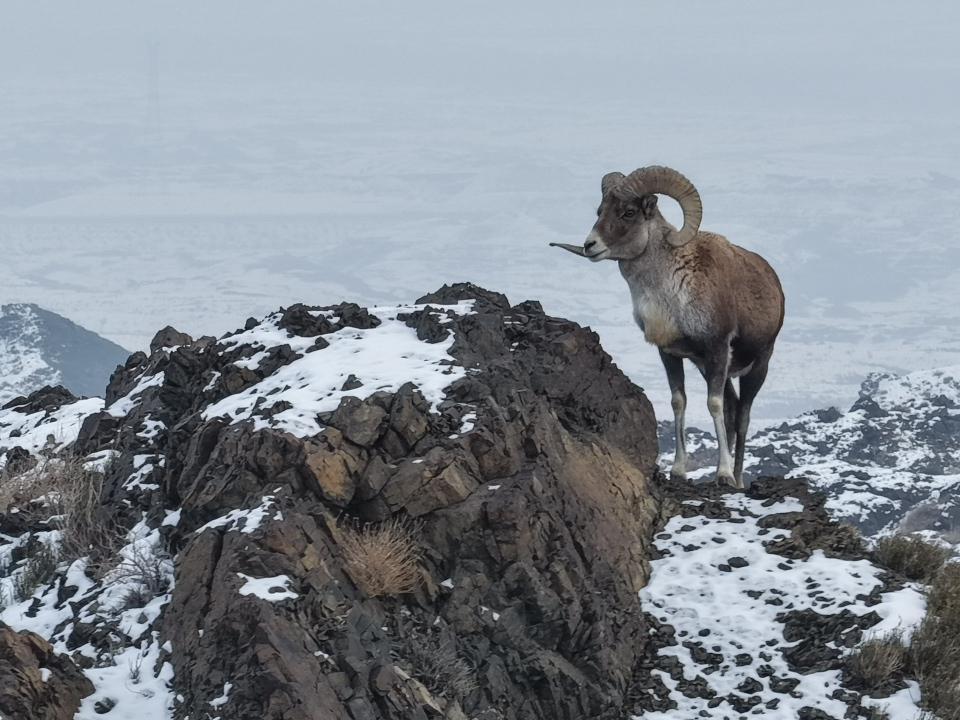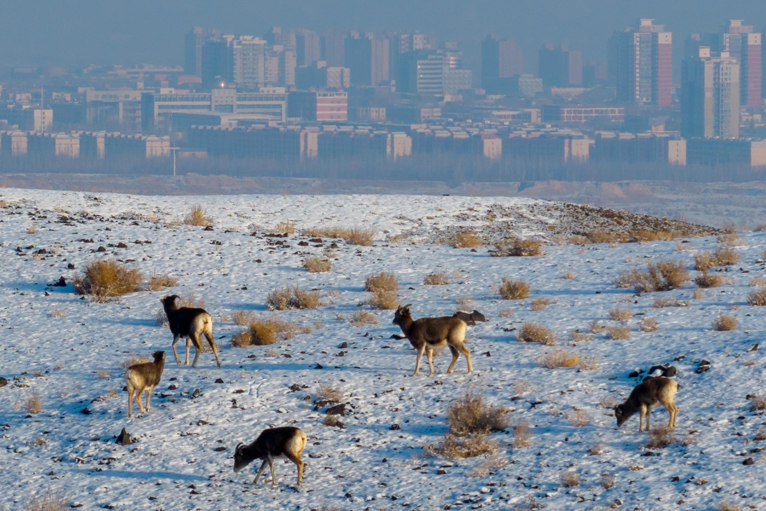1月21日,雌性盘羊带着幼崽在雪地觅食。它们一侧的城市容貌清晰可见。