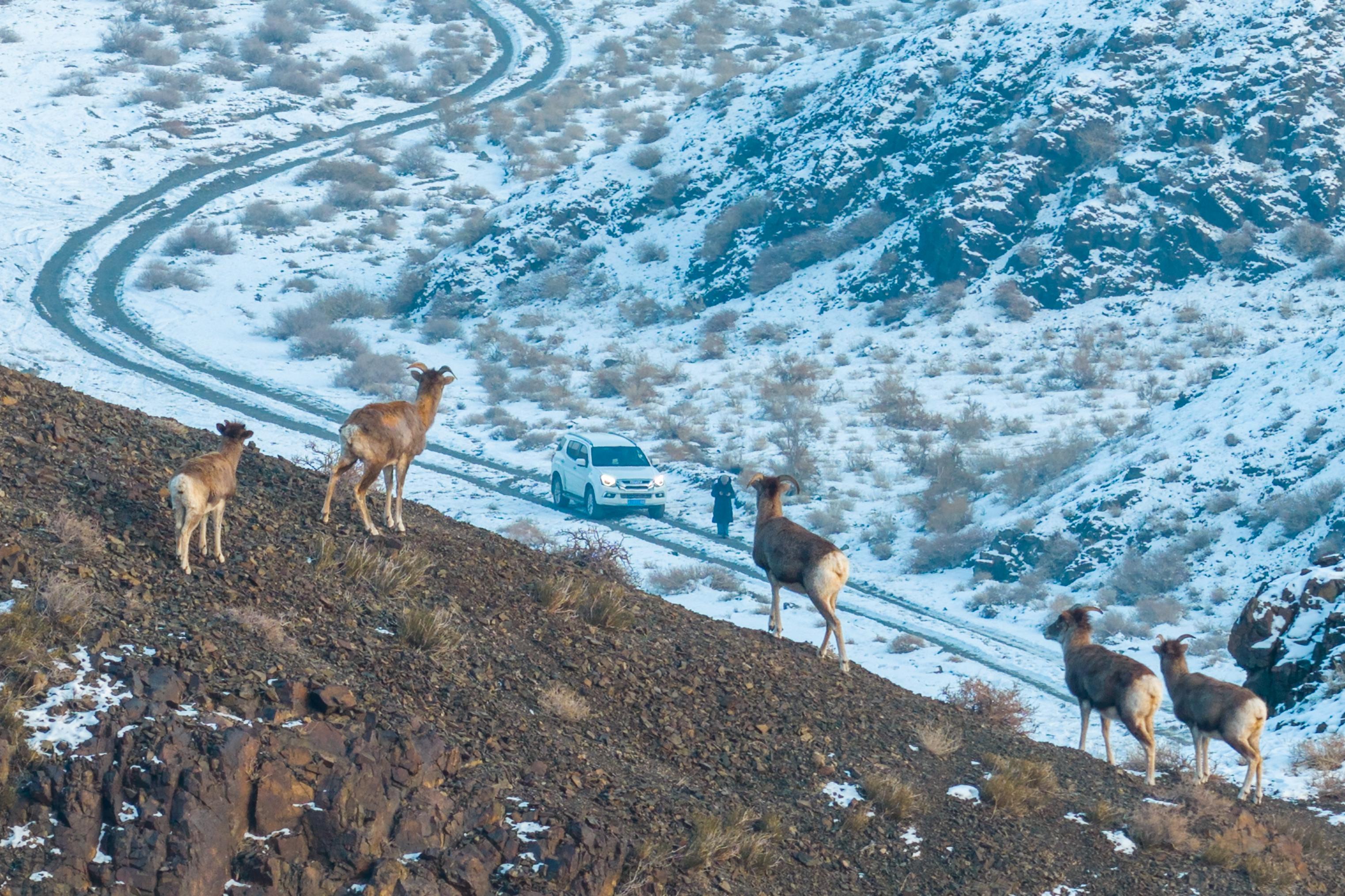 1月26日,盘羊妈妈带着幼崽停下脚步,似乎是为了俯瞰一位自驾摄影爱好者在车前创作。