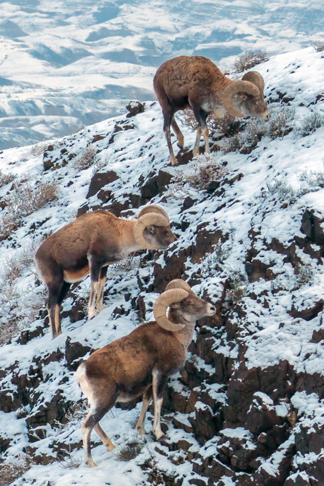 1月22日,3只成年雄性盘羊在白雪覆盖的山坡上进食。