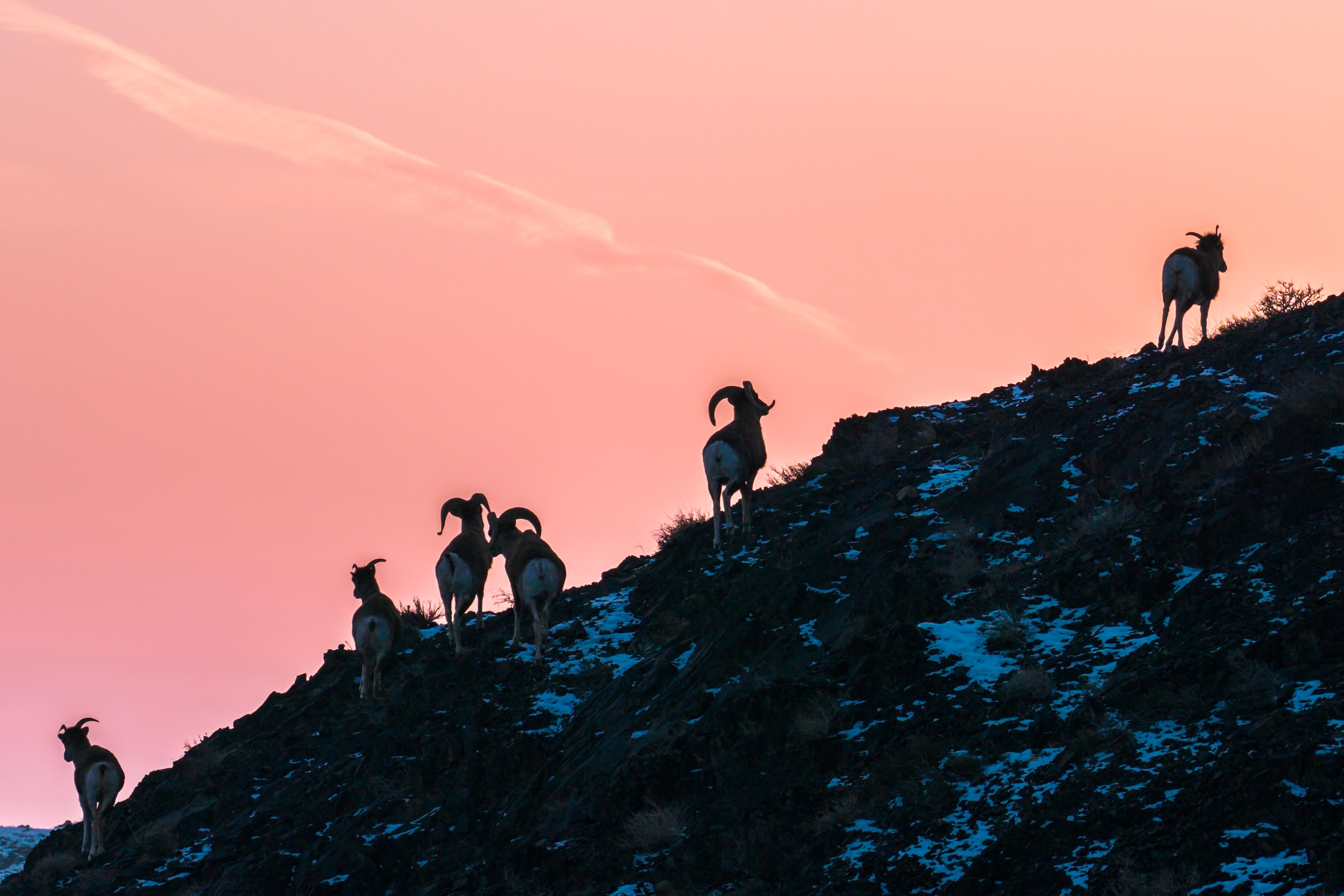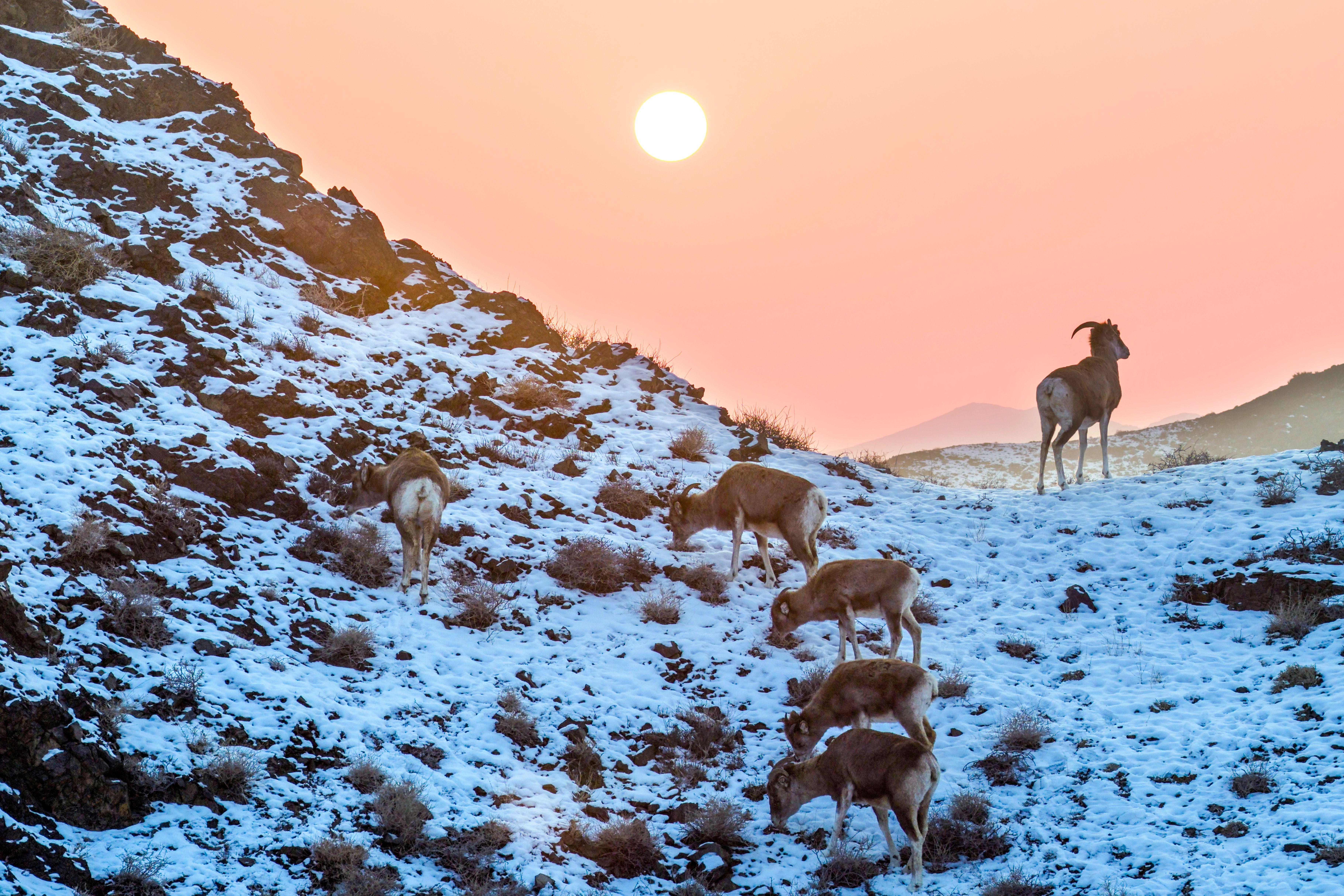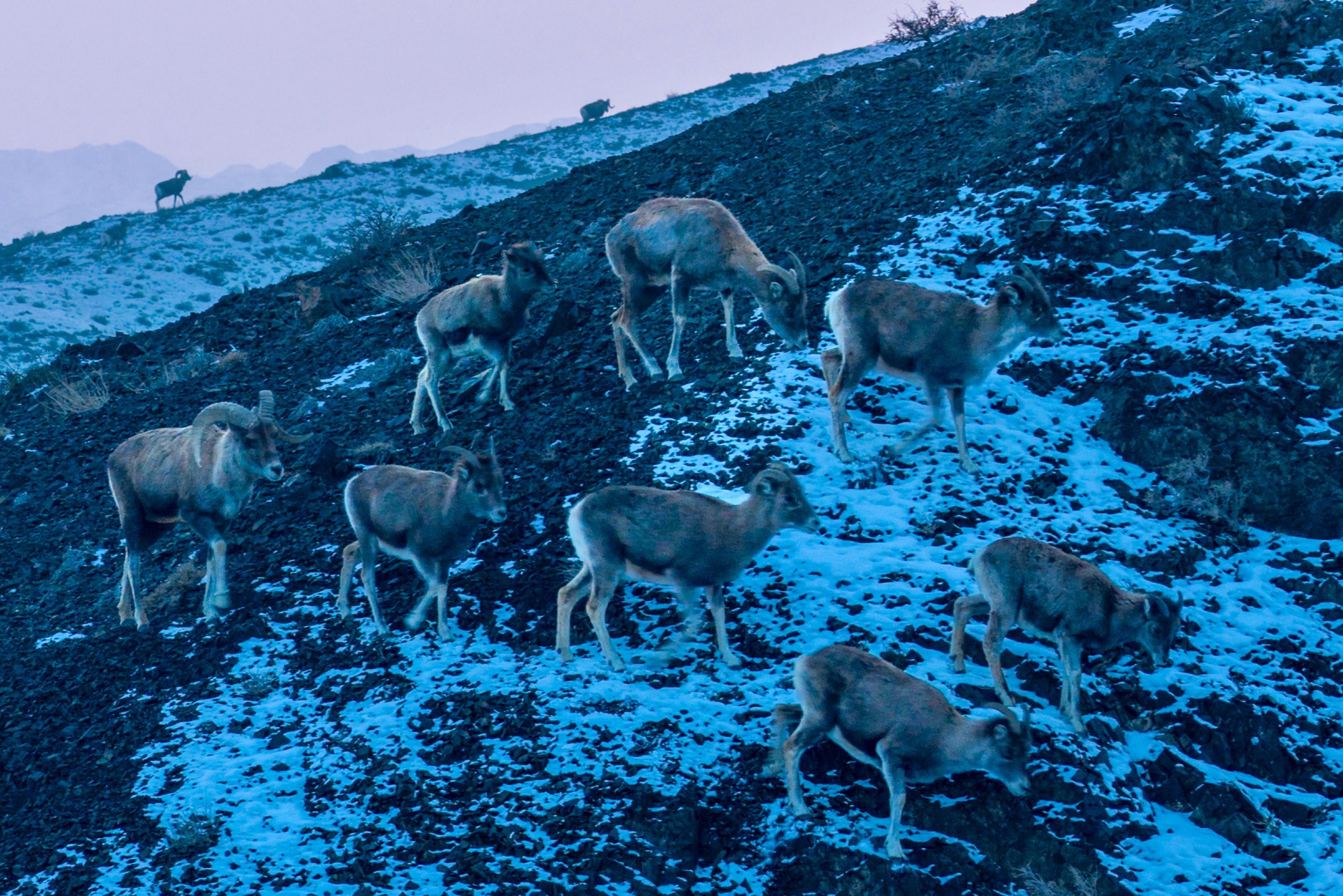 1月26日,一群觅食的盘羊行进到山坡上,恰好沐浴在暮光之下。