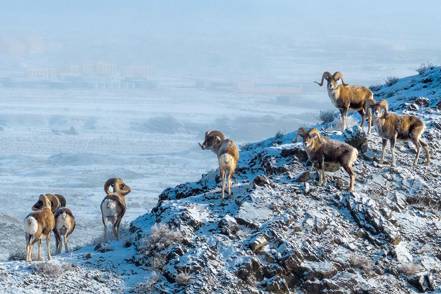 1月17日,克拉玛依市区北郊山野,7只成年雄性盘羊站立在山坡上。虽然晨雾漫漫,但离它们不远处的城市楼宇依稀可见。