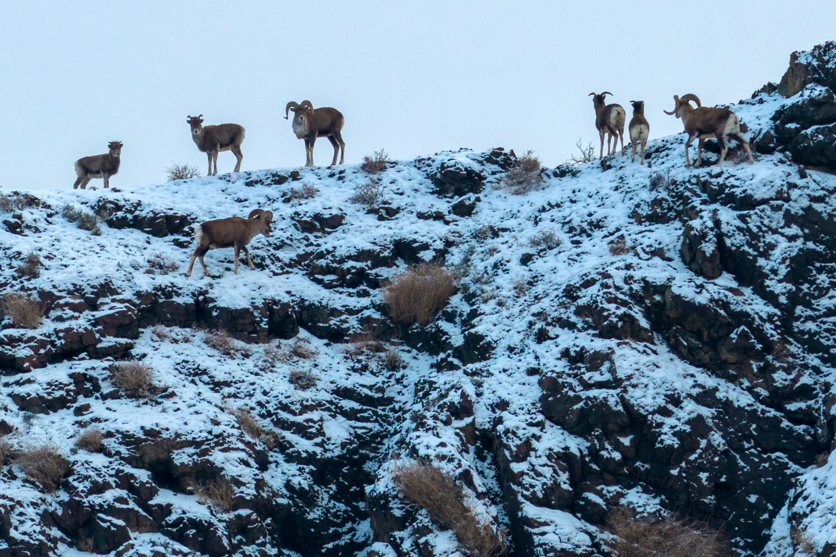 1月22日,7只矗立在山坡上的盘羊准备走下山坡。