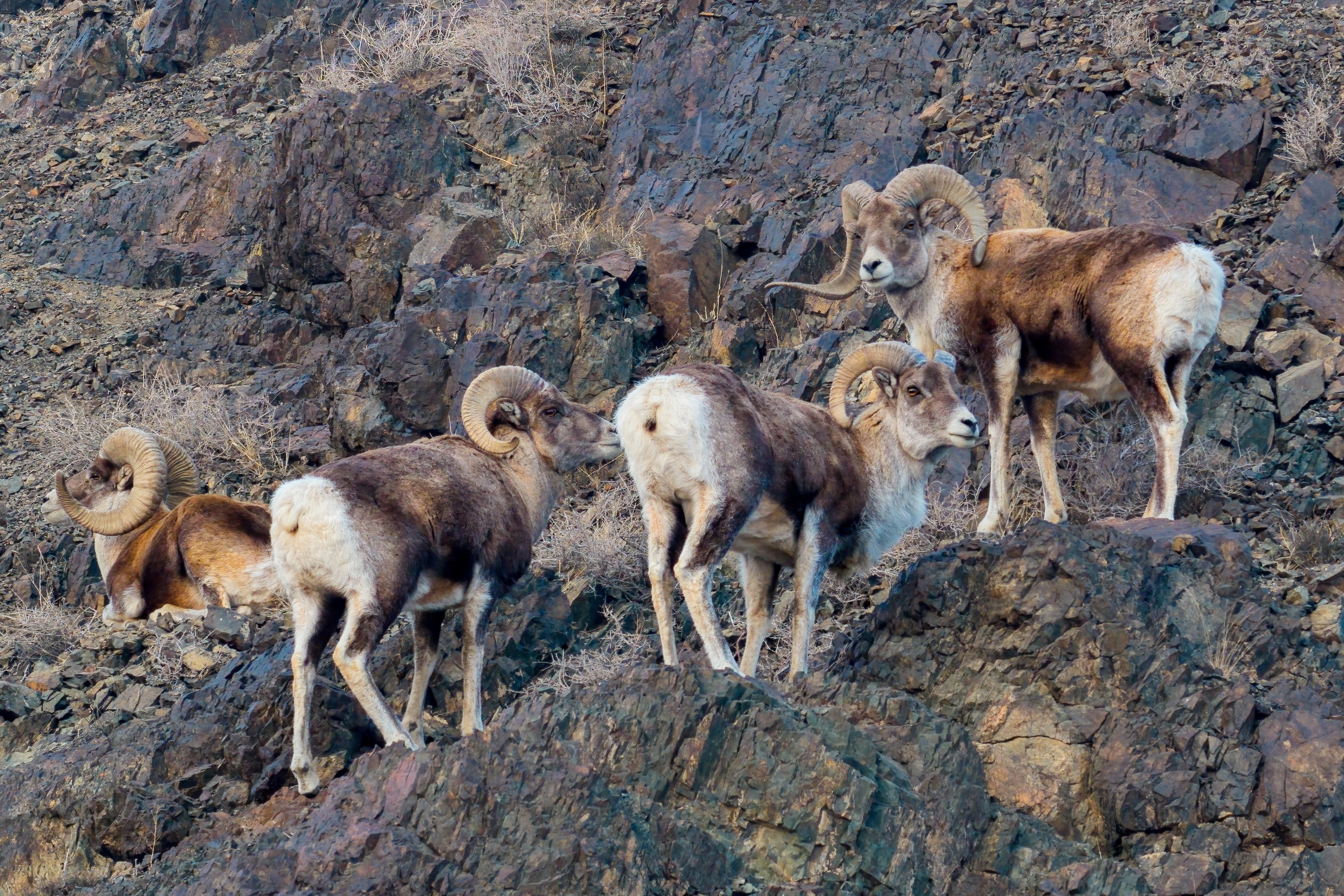 1月27日,一群雄性盘羊在峭壁间觅食。