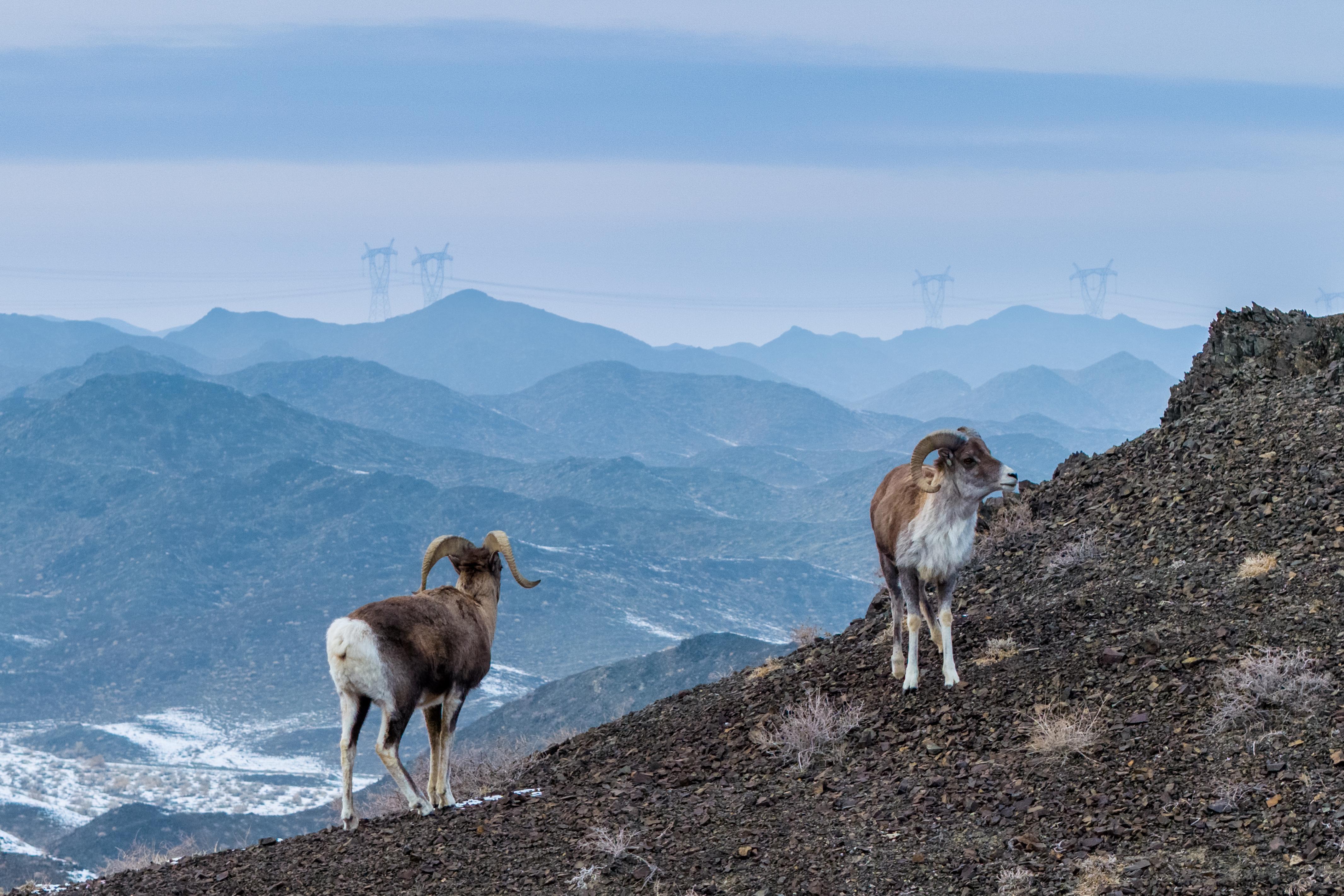 2月5日,两只盘羊在山梁上伫立,它们的另一侧是绵延起伏的阿伊尔山。