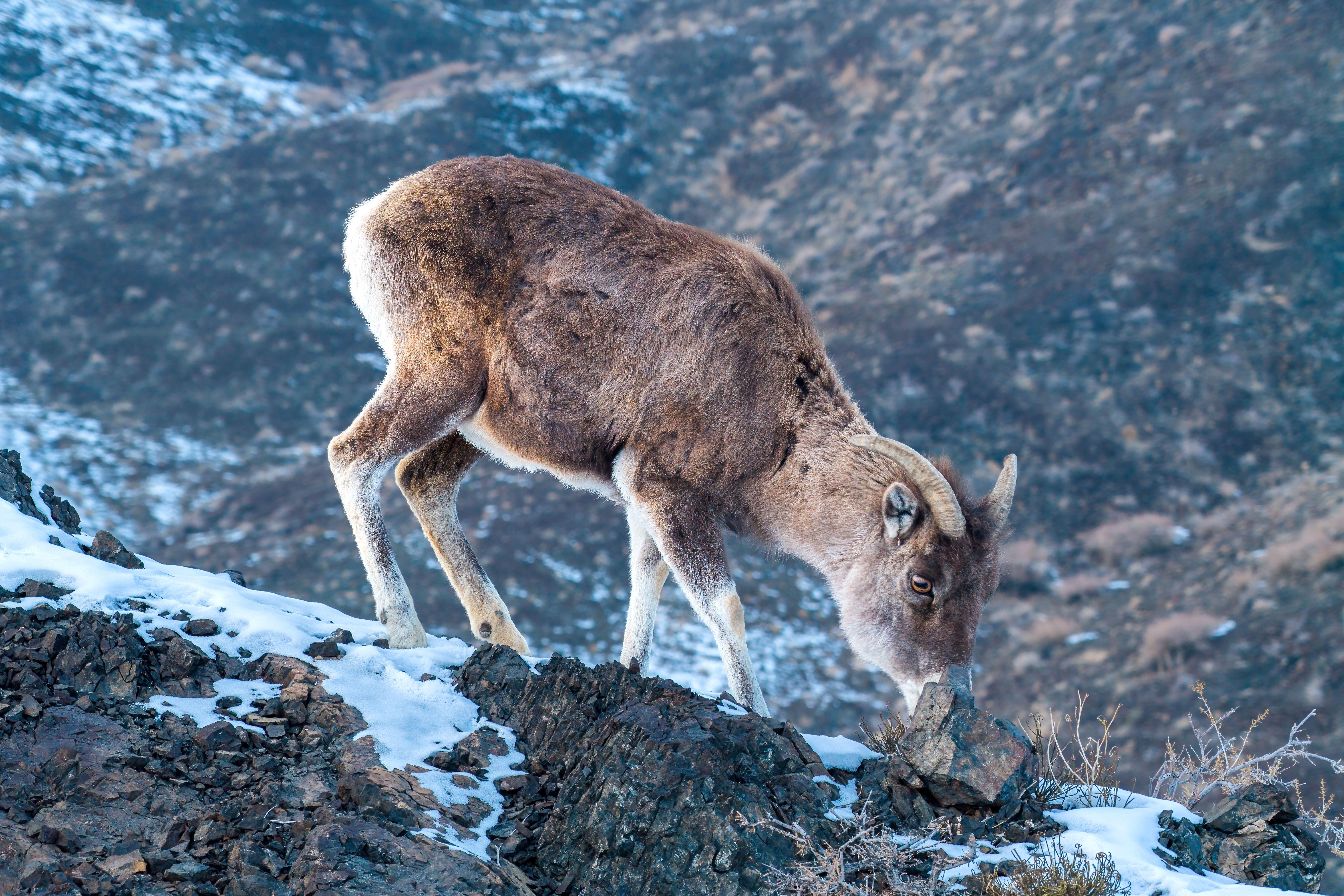 1月27日,一只雌性盘羊在觅食,它的角短细呈镰刀状。