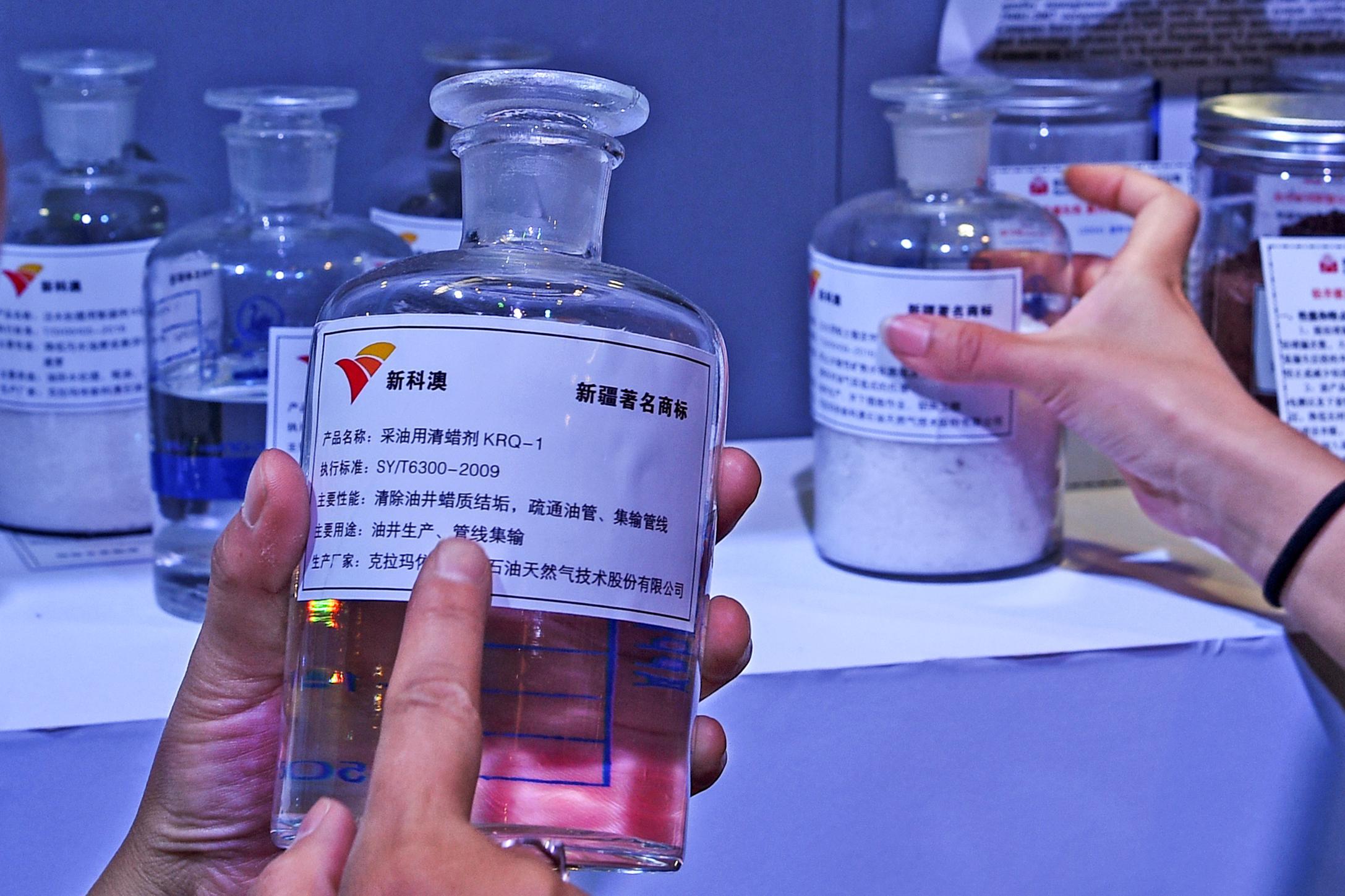 亚欧博览会上,新科澳公司的破乳剂等化工产品备受关注。克拉玛依融媒记者 闵勇 摄