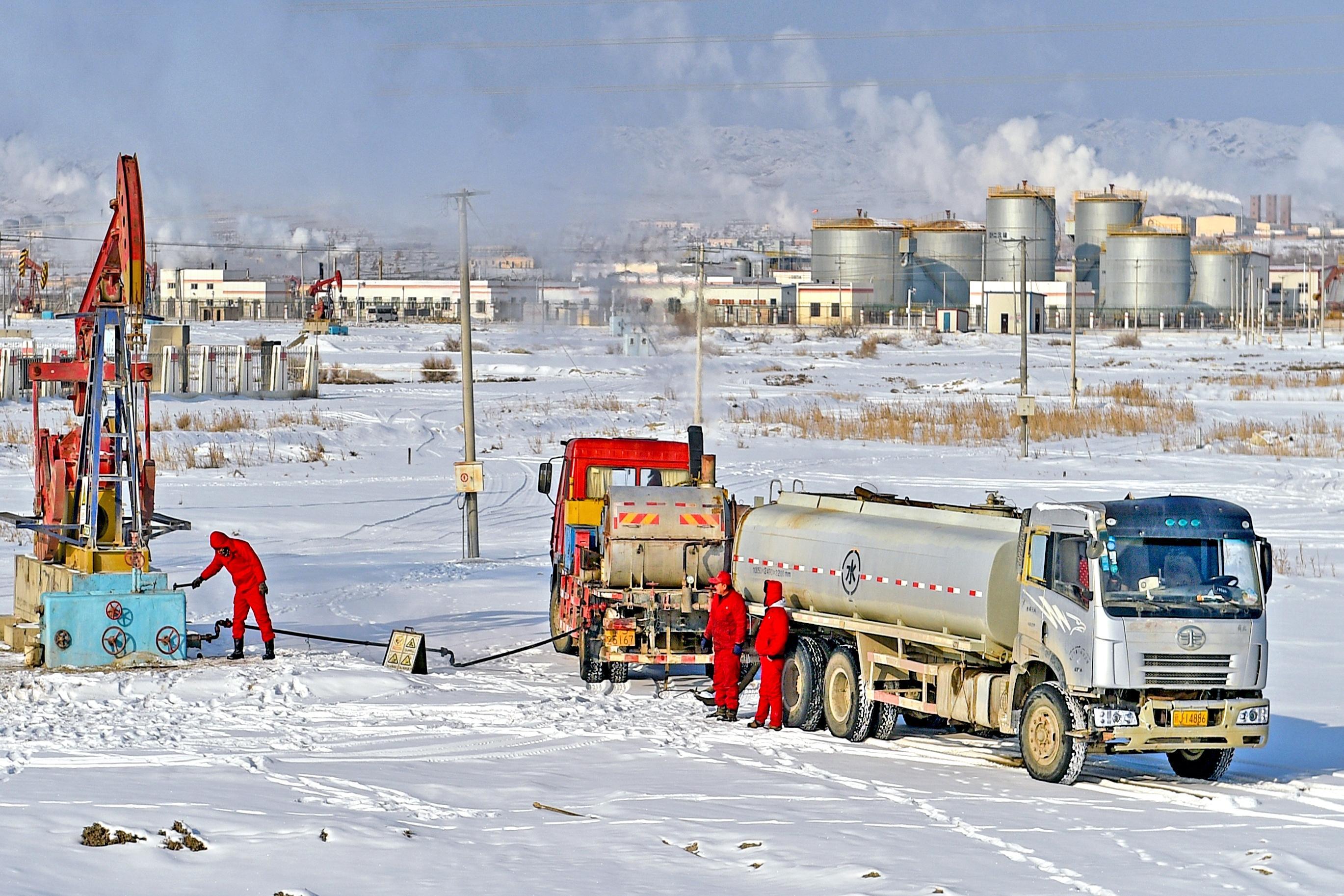 新科澳公司员工正在采油二厂冬季油气生产现场进行热洗作业。克拉玛依融媒记者 闵勇 摄