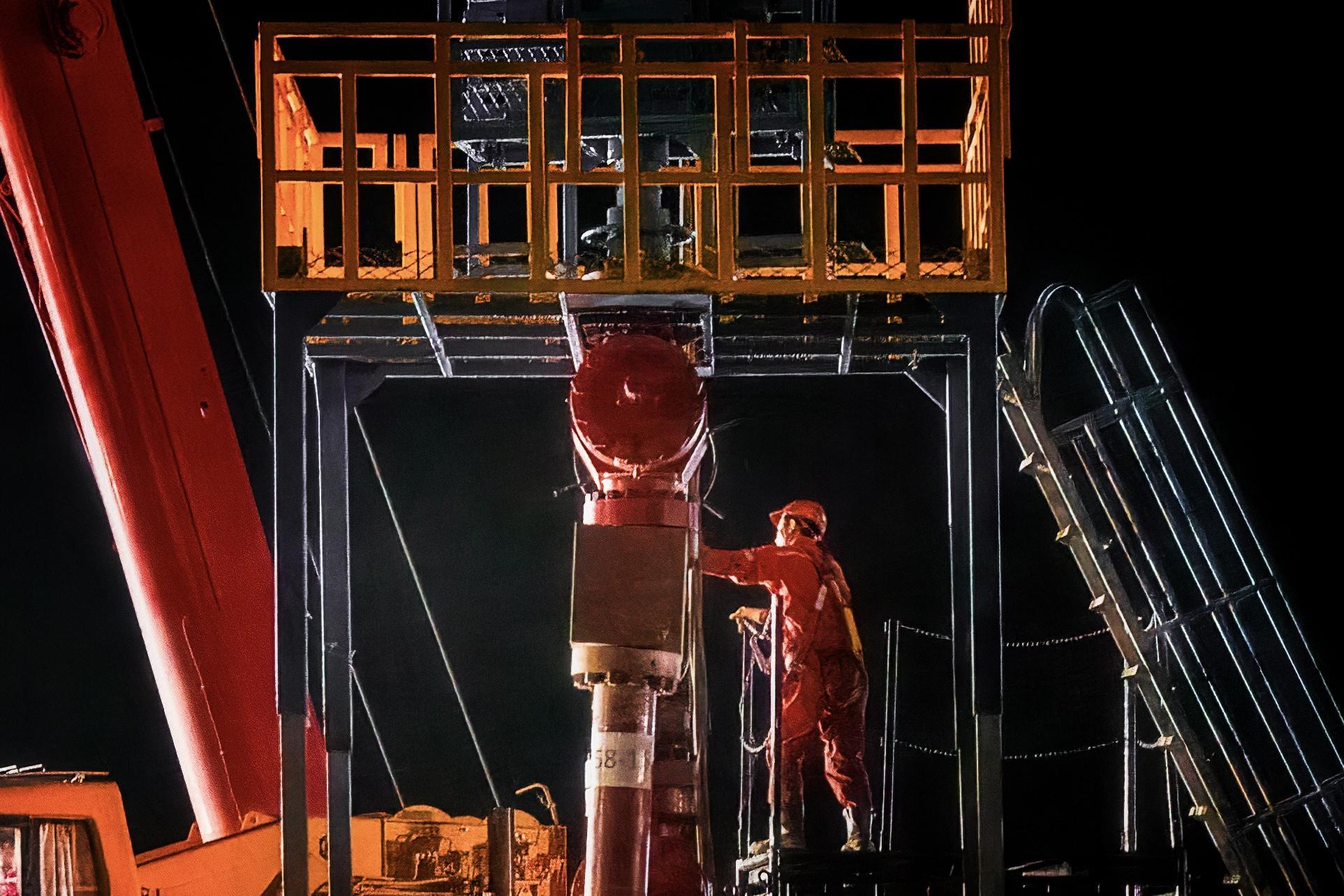 2025年3月28日夜,示范区施工现场,一位工人正在安装井口装置。