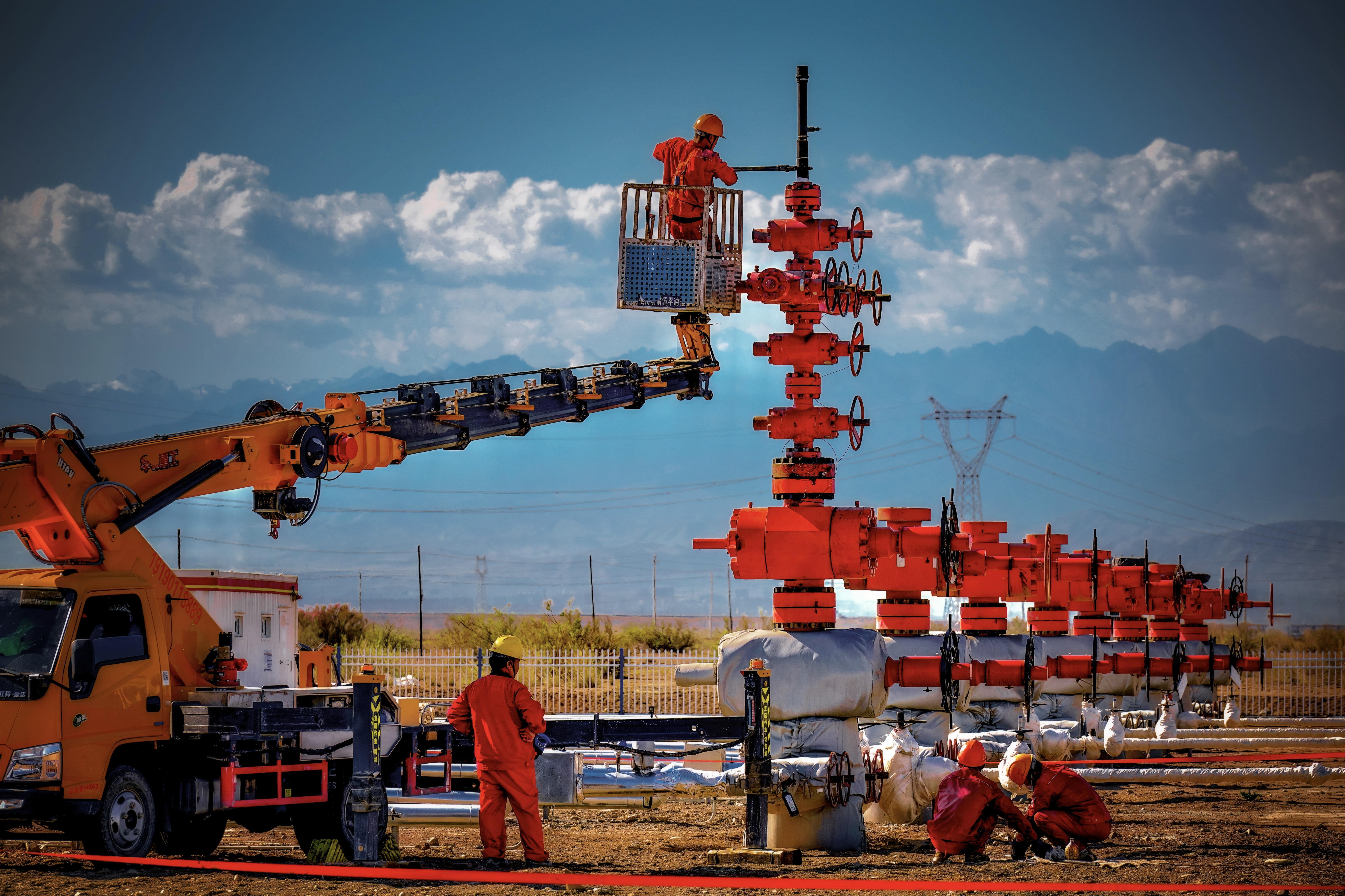 2025年8月13日,新疆吉木萨尔国家级陆相页岩油示范区(简称示范区),施工人员正在安装防喷装置,让测井设备安全进入地层摸清井下状况。