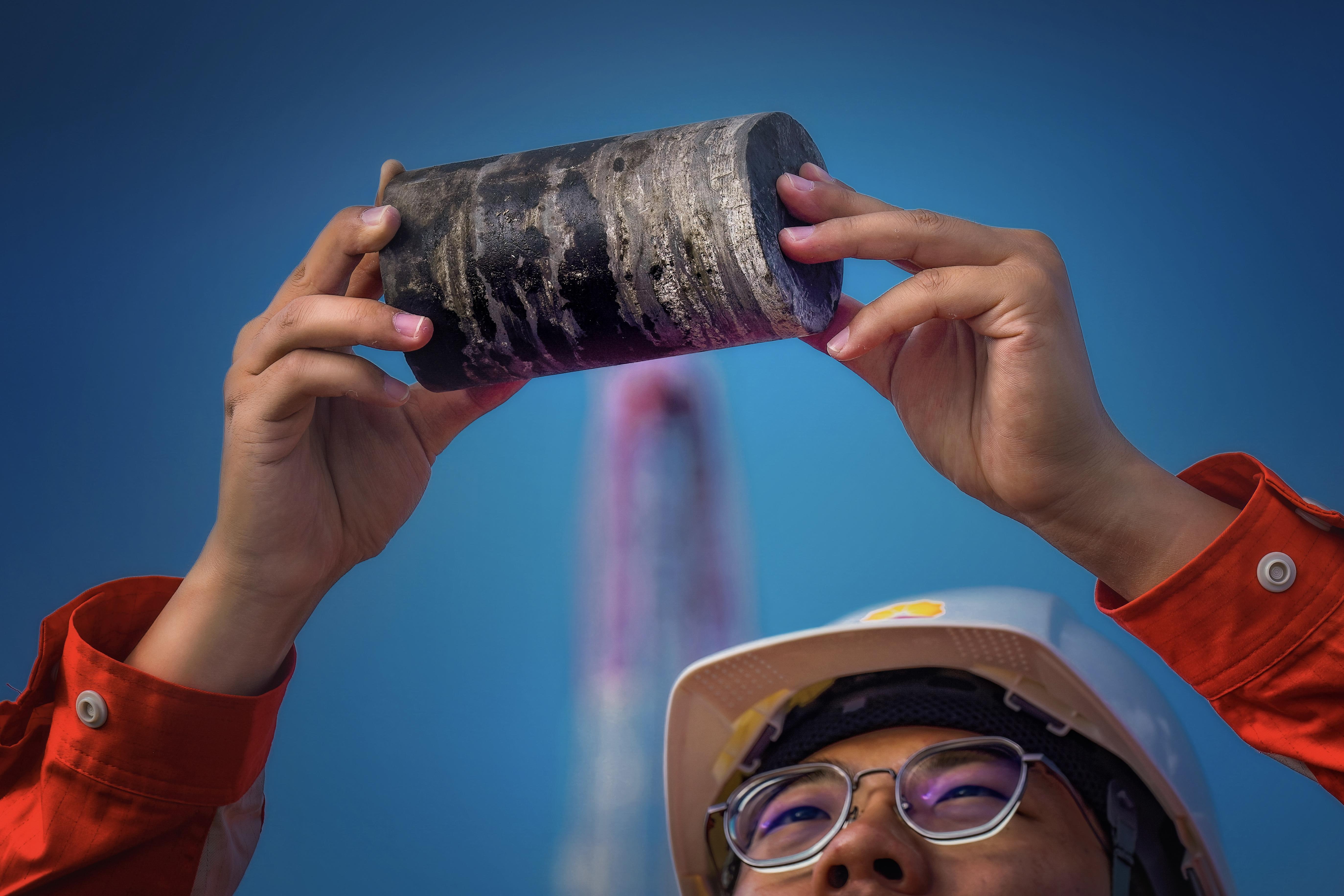2025年8月13日,示范区钻井现场,科研人员王良哲查看页岩芯。