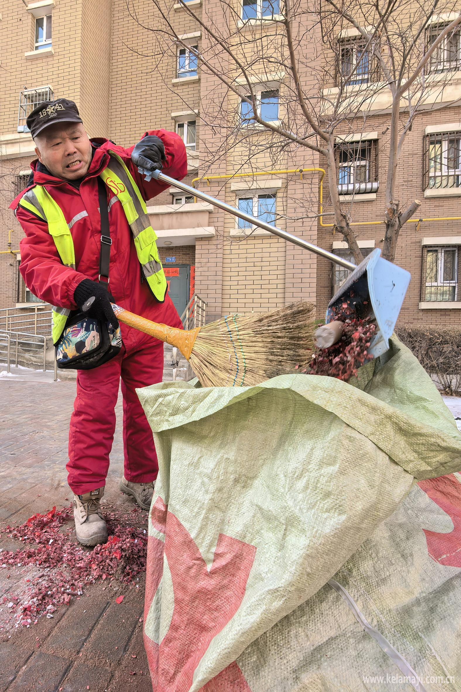 2月17日,克拉玛依区昆仑路街道平安苑社区,物业工作人员清扫烟花爆竹碎屑。克拉玛依融媒记者 闵勇 摄