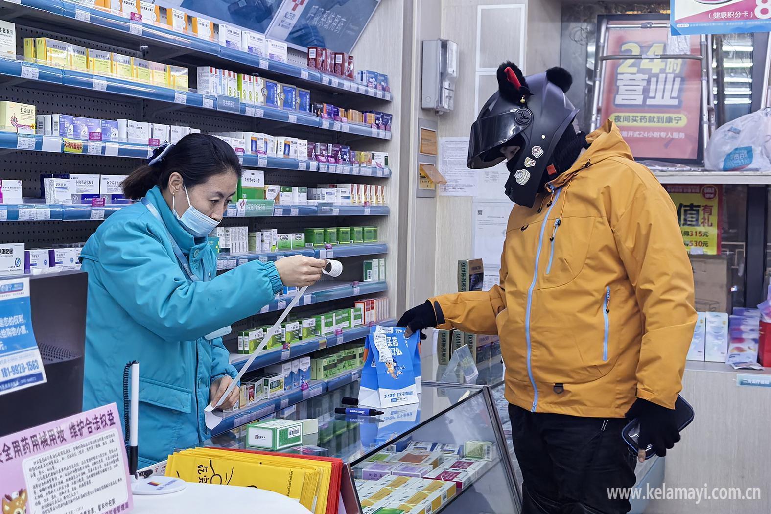 2月18日晚,克拉玛依区一家24小时营业药店,工作人员给外卖员打包药品。克拉玛依融媒记者 崔文娟 摄