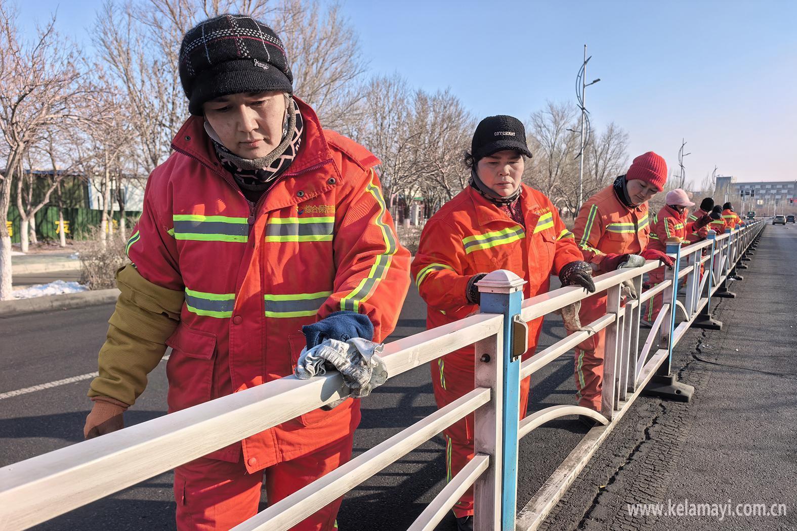 2月16日,克拉玛依区西环路,环卫工人清洁道路隔离栏。克拉玛依融媒记者 闵勇 摄