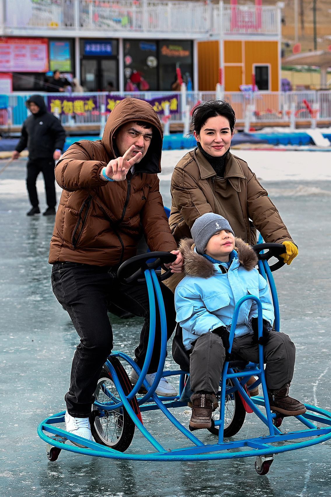 2月22日,克拉玛依区金龙湖景区,市民与游客共骑冰车滑行,笑声不断。克拉玛依融媒记者 努尔夏提·尼加提 摄