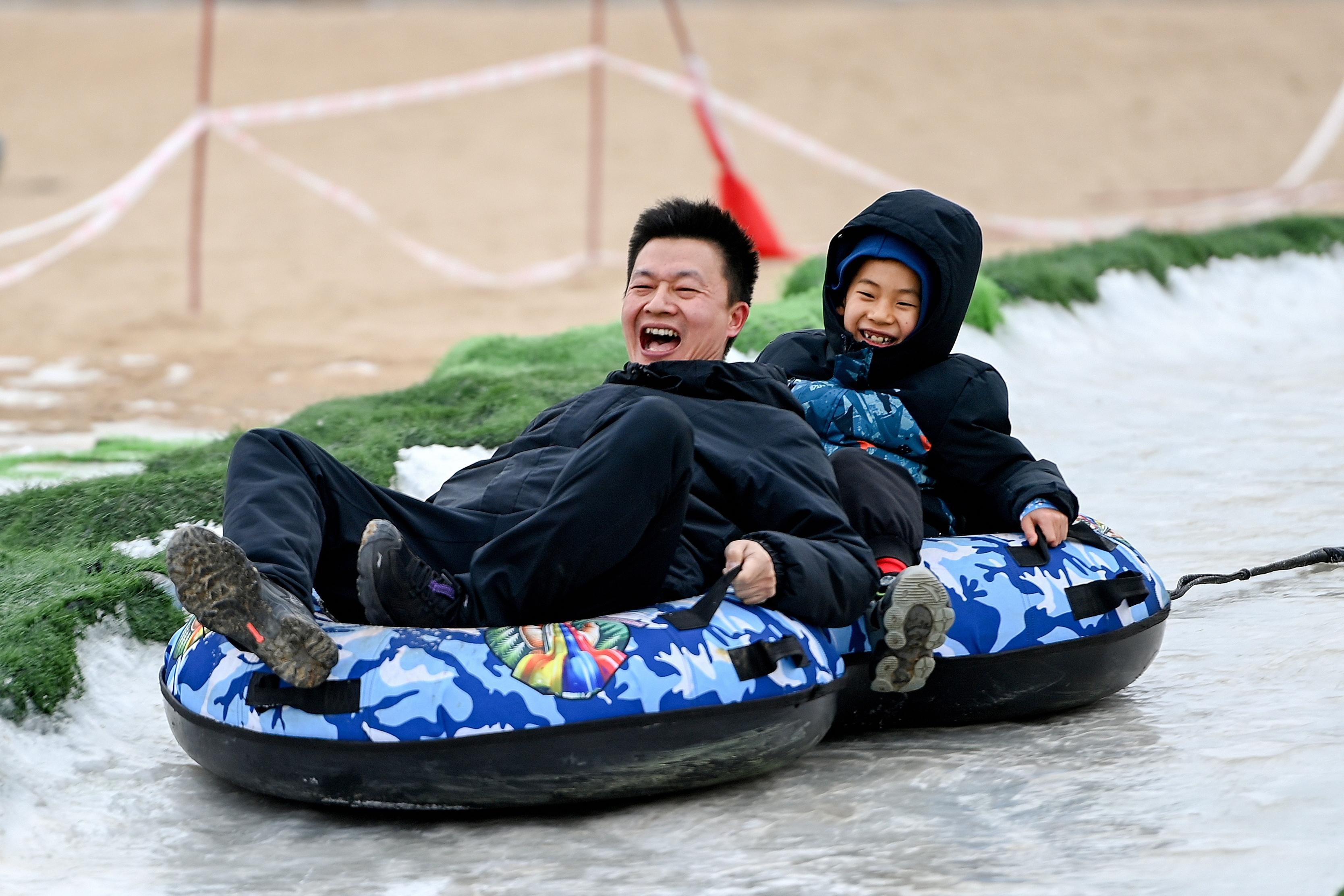 2月22日,克拉玛依区金龙湖景区,两名游客乘坐雪圈从冰道上飞驰而下。克拉玛依融媒记者 努尔夏提·尼加提 摄