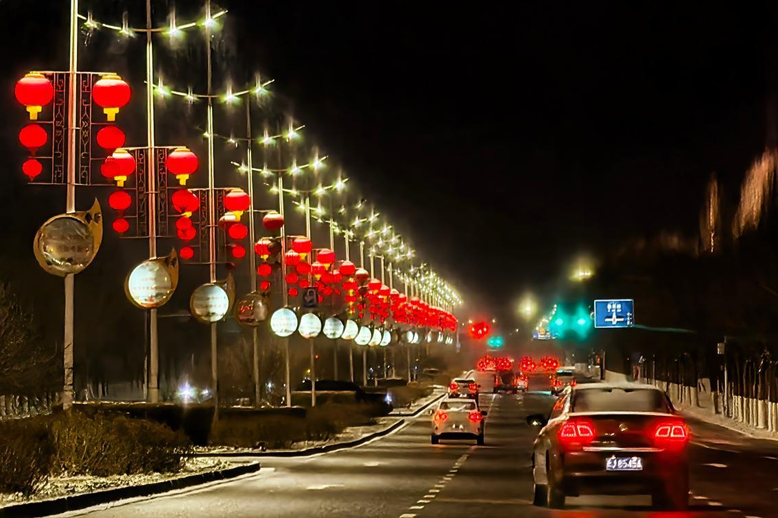 2月17日,克拉玛依市区世纪大道两旁,大红灯笼将城市夜晚装扮得美丽如画。克拉玛依融媒记者 闵勇 摄