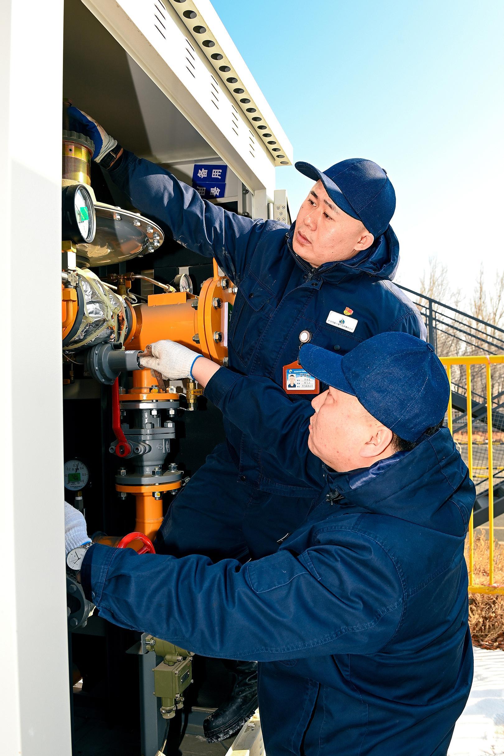 “压力表读数正常,各项指标均在正常范围内,接口无泄漏,设备运行稳定,接下来咱们去检查下一个点位……”2月17日11时许,李佳选和同事来到汇嘉时代克拉玛依购物中心旁,对室外调压柜、阀门、燃气管线进行例行安全巡检。