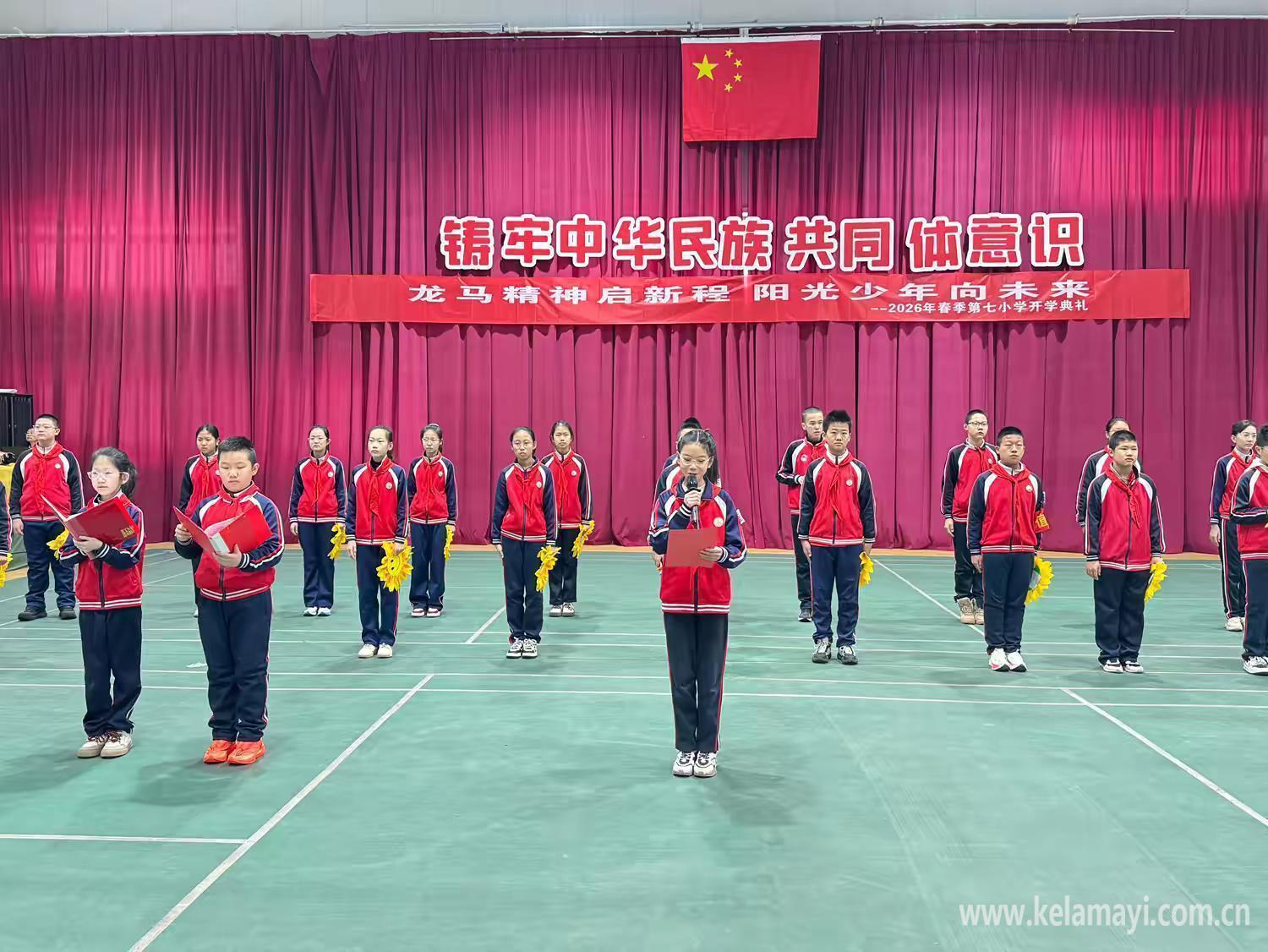 独山子区第七小学举行“龙马精神启新程 阳光少年向未来”2026年春季开学典礼。(图片由独山子区第七小学提供)