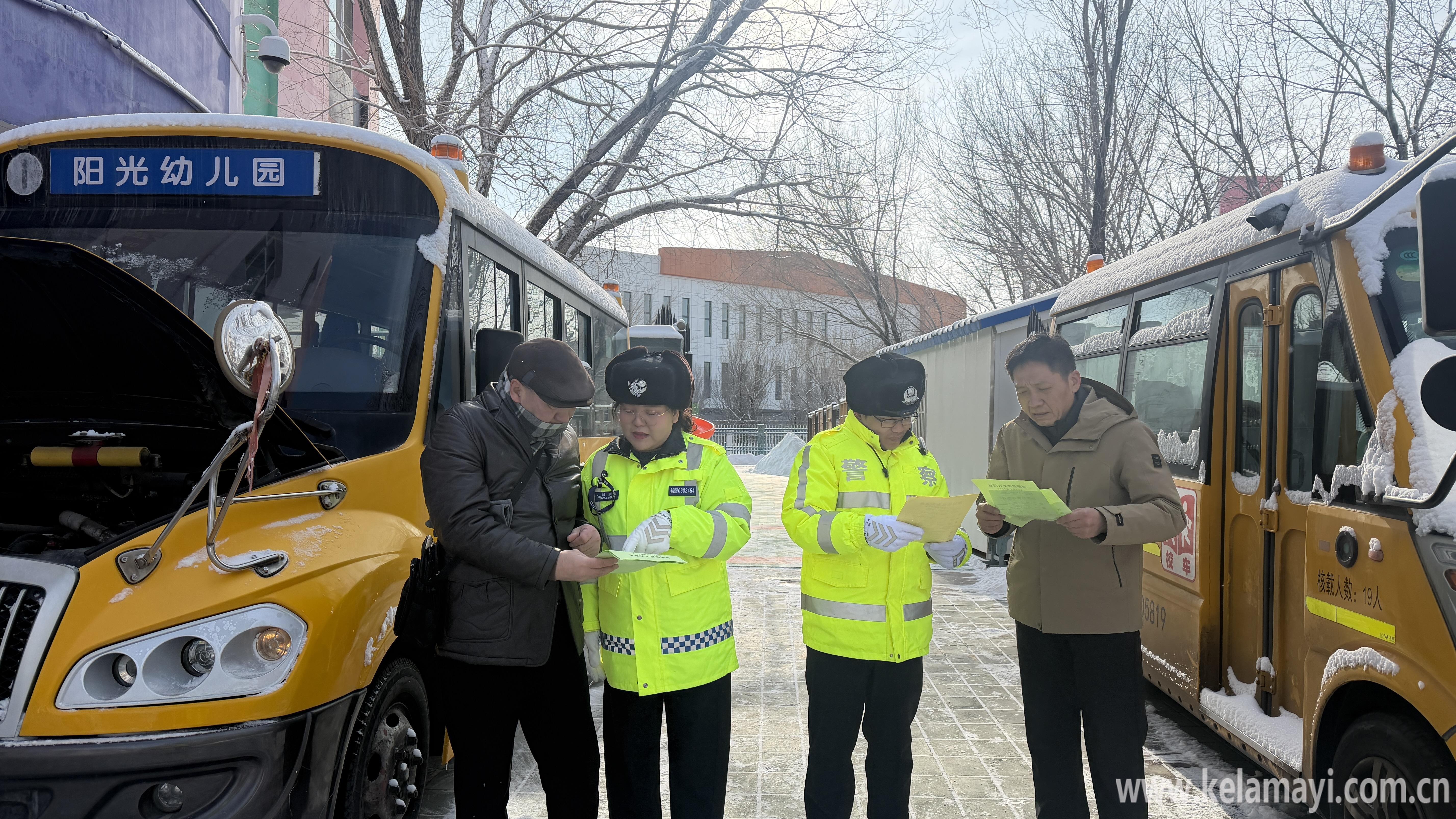 2月28日,开学前夕,民警深入克拉玛依区阳光幼儿园,对校车开展全方位安全大检查。检查中,民警重点对校车的制动系统、轮胎磨损、灯光信号等关键部位进行细致查验,并对安全带、逃生锤、灭火器、急救箱等安全设施逐一核对,确保每一辆校车安全性能完好有效,不留任何隐患。同时,民警现场为校车驾驶人开展专题安全教育,结合春季行车特点,详细讲解雪雾天气驾驶要领和应急处置流程,叮嘱驾驶人严守交规、平安驾驶,从源头上拧紧校车“安全阀”。