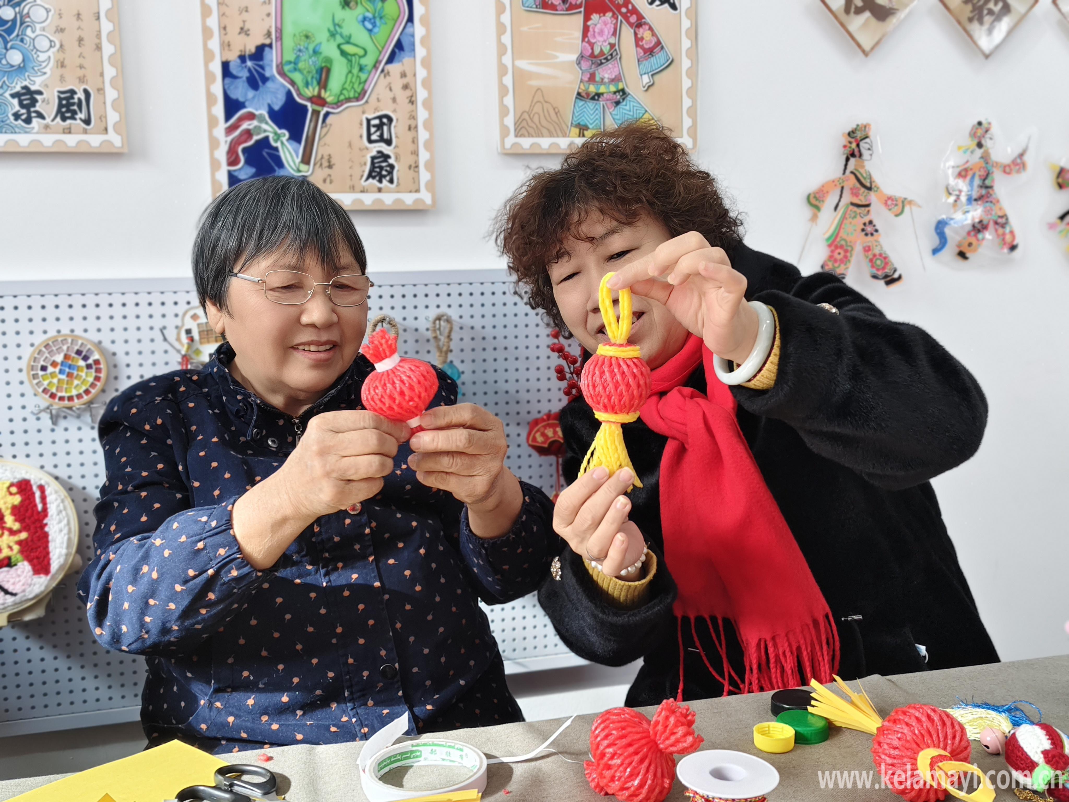 2月28日,白碱滩区金龙镇街道金华社区开展“浓情元宵暖邻里·喜乐团圆聚民心”学雷锋主题志愿服务活动,两位居民通过旧物品改造制作红灯笼。冯玉鑫 摄