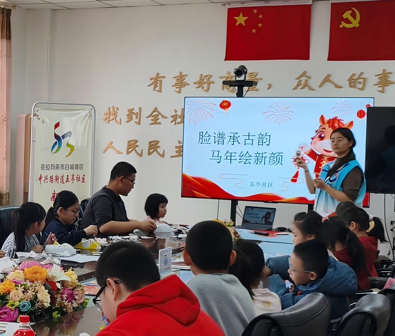 古丽扎旦·苏力堂在五亭社区活动室开展手绘脸谱活动。图片由白碱滩区五亭社区提供