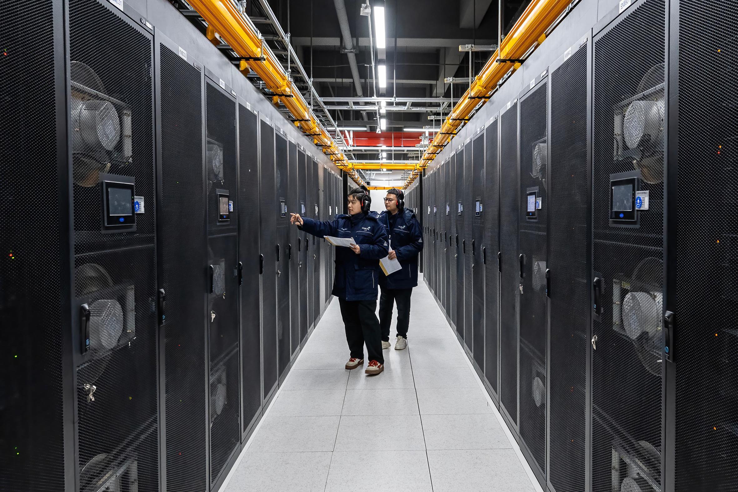 2025年2月,技术人员在新疆克融云算数字科技有限公司机房巡查数据运行情况。克拉玛依融媒记者 闵勇 摄