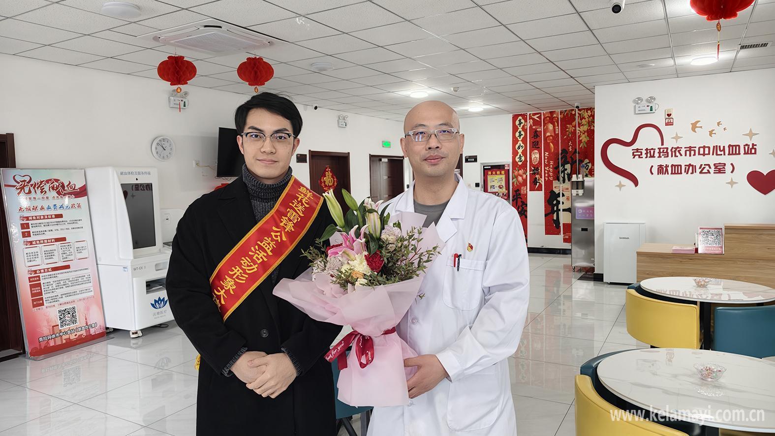 送花小分队将鲜花送给无偿献血先行者胡荣。克拉玛依融媒记者 马丽莎 摄