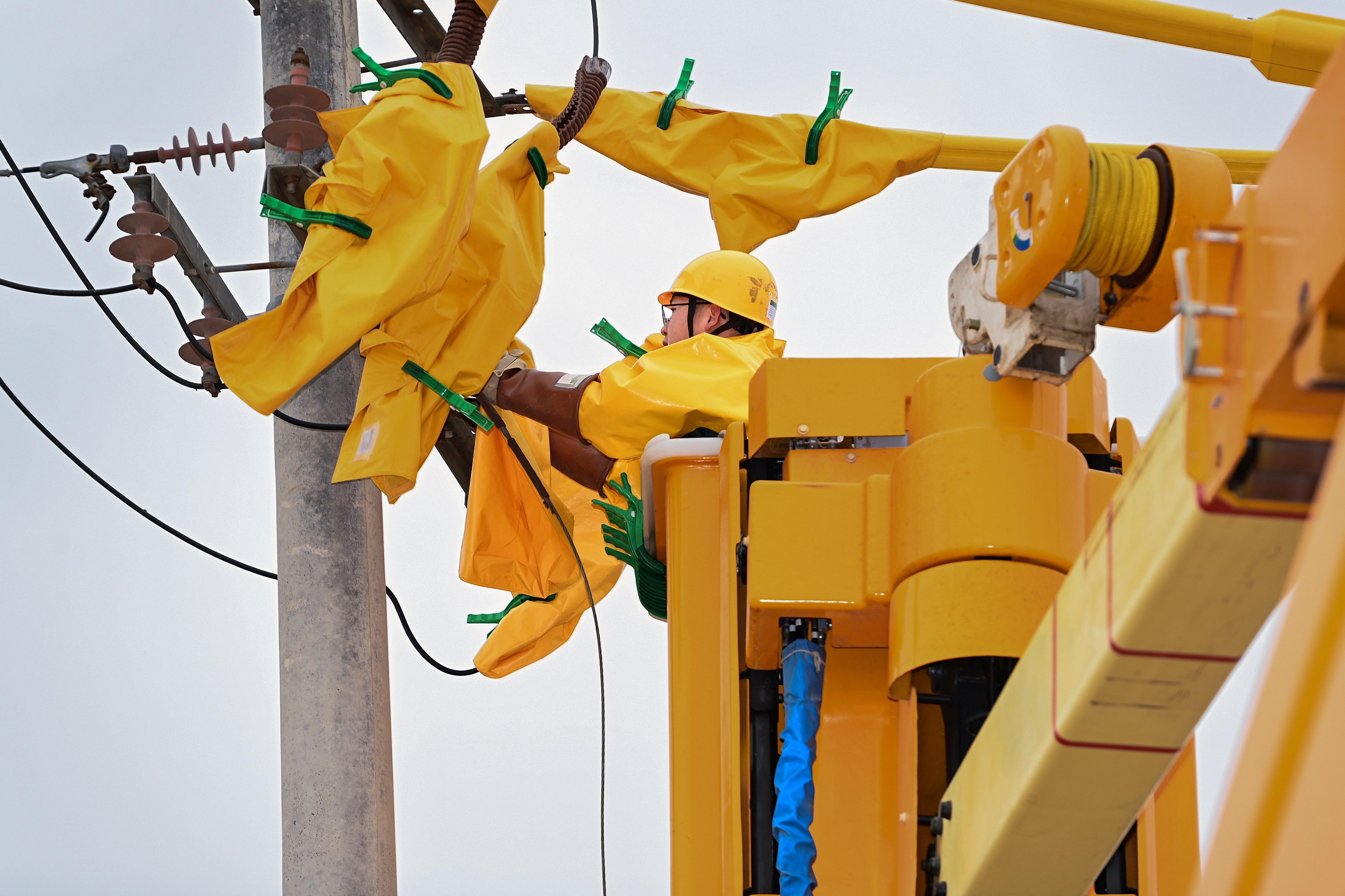 国网克拉玛依供电公司工作人员正在斗臂车内进行带电作业。克拉玛依融媒记者 努尔夏提·尼加提 摄