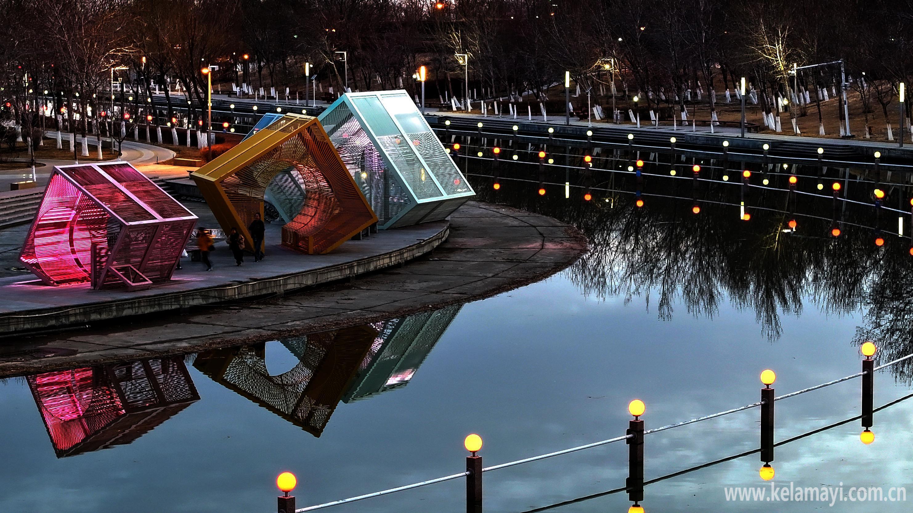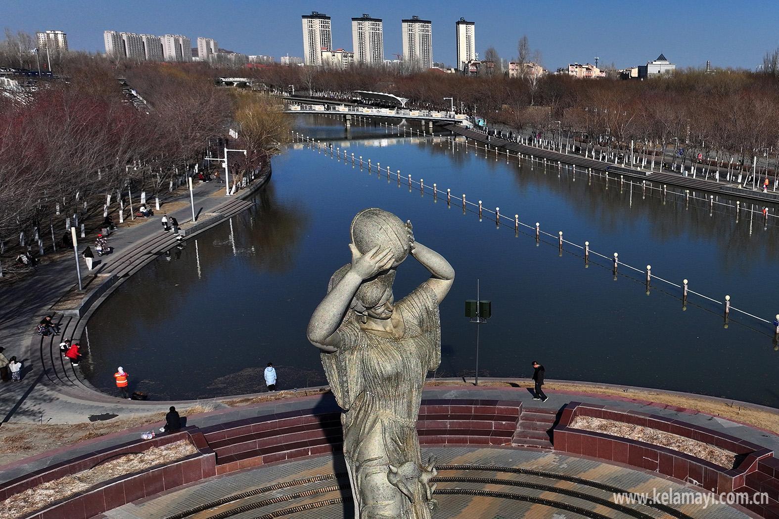 造型别致的彩色雕塑群坐落在河边,扮靓克拉玛依河。