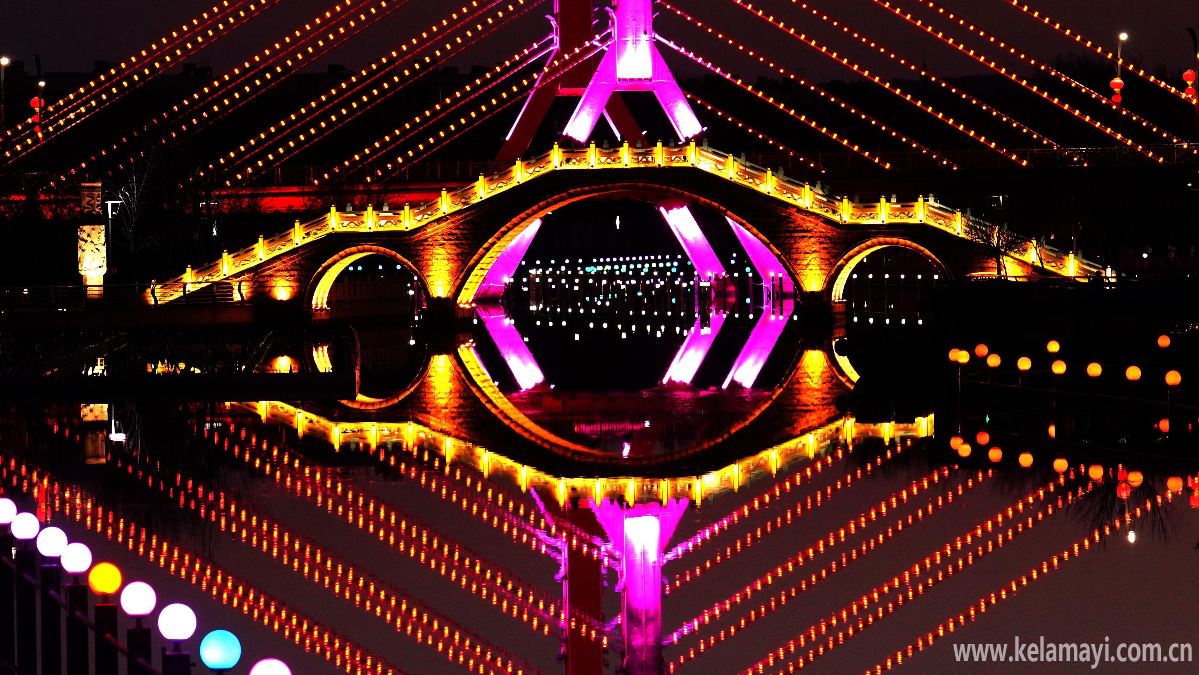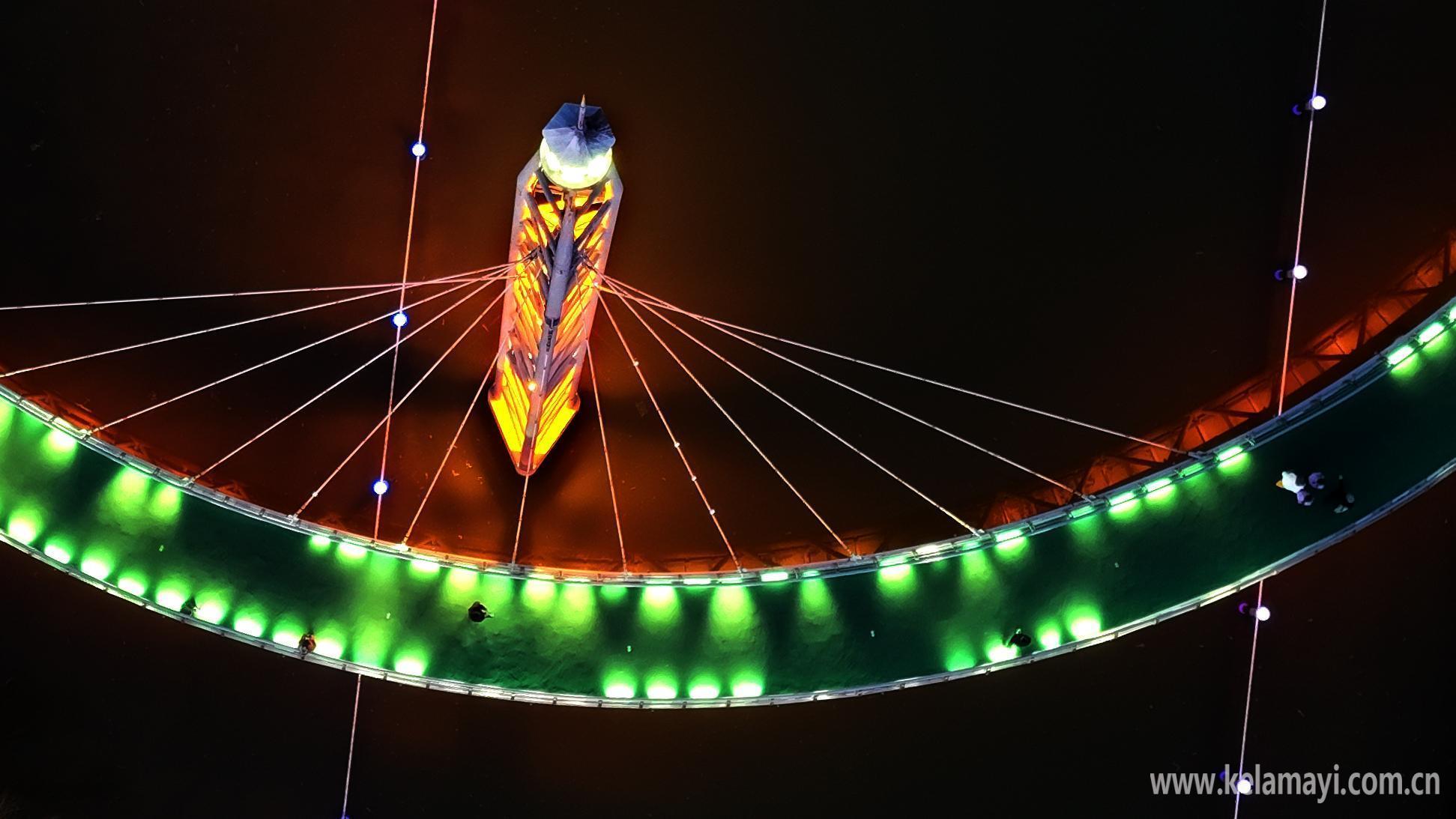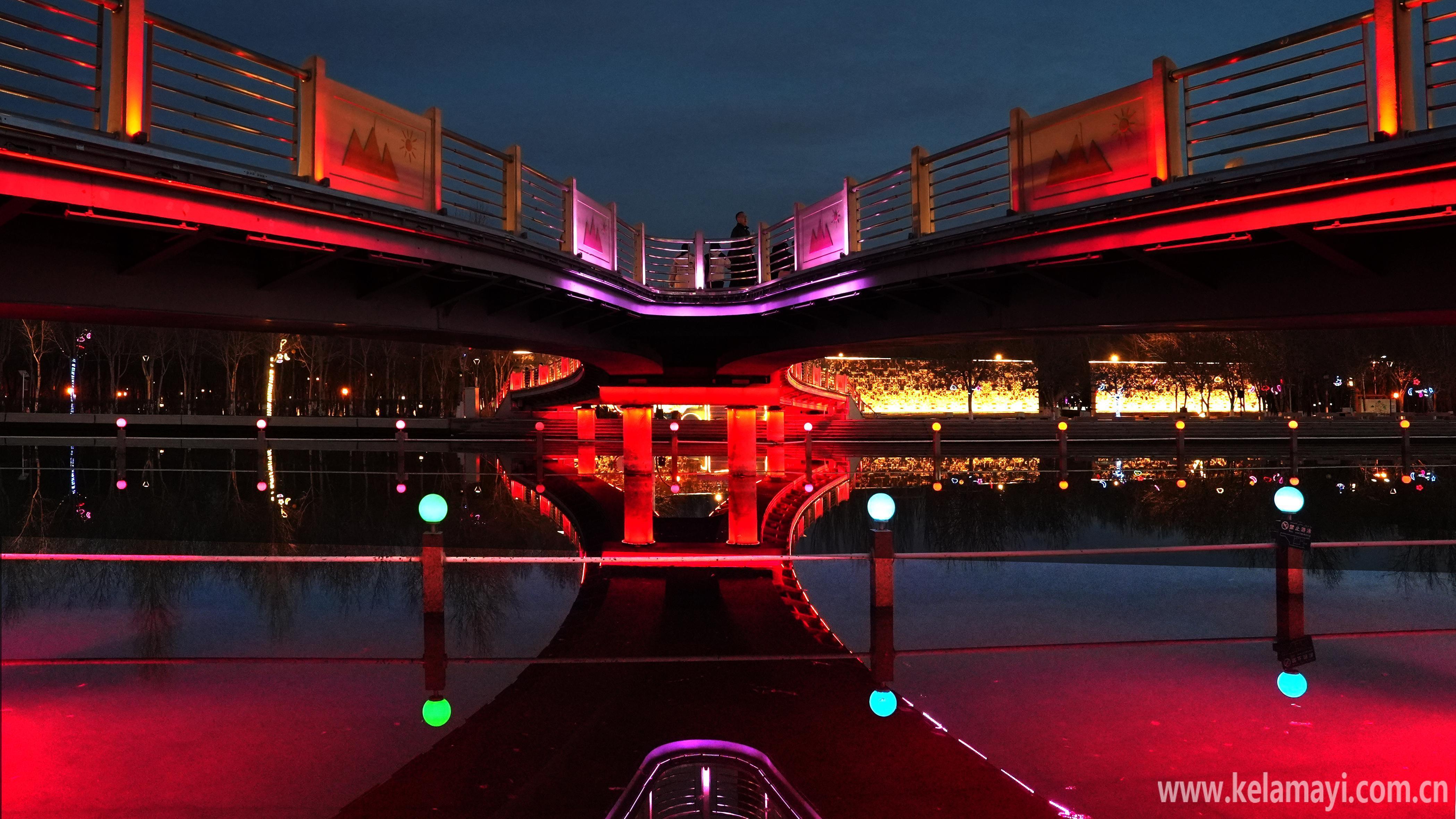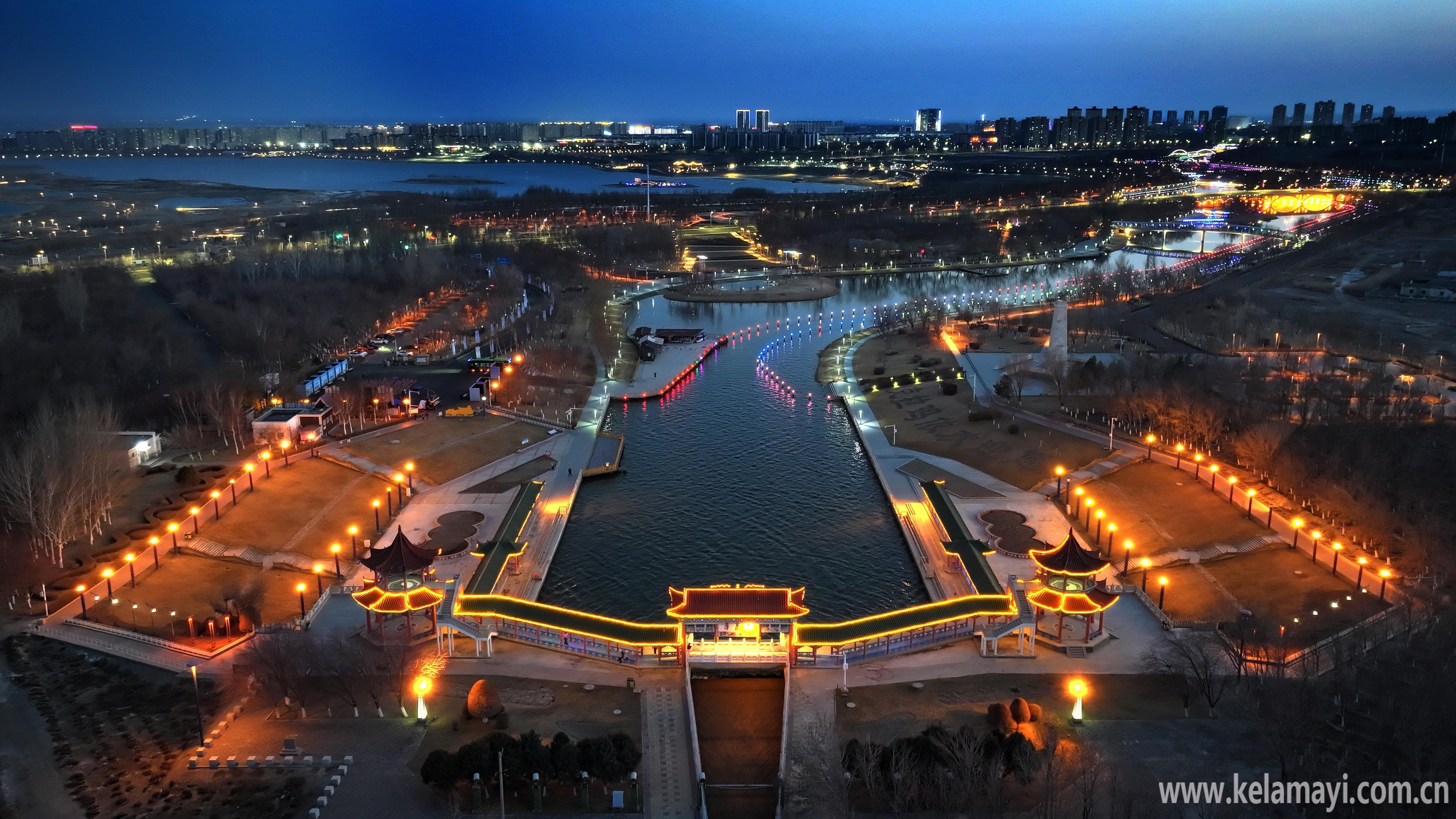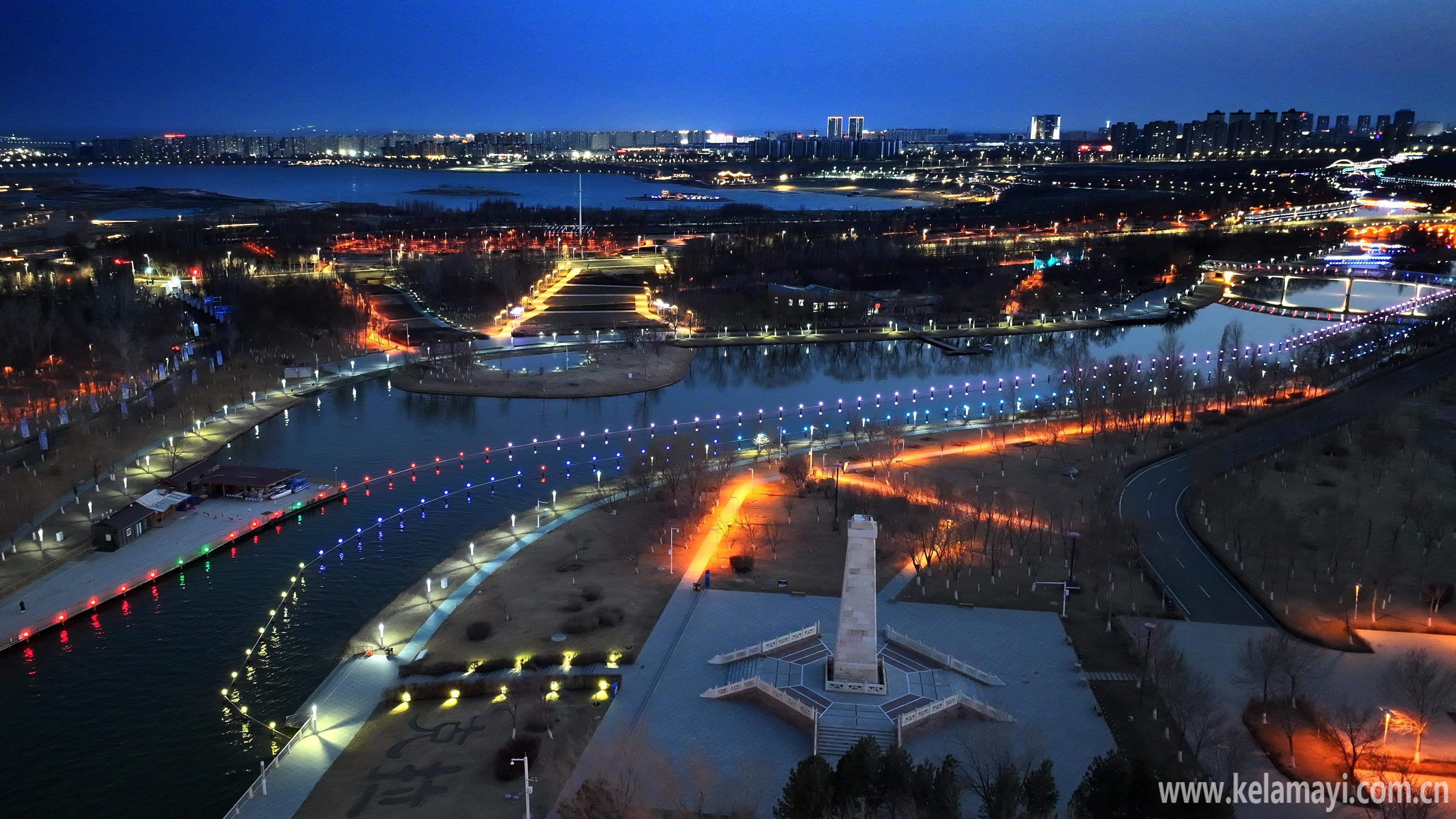 九龙潭景区的璀璨灯光与克拉玛依河道中的灯光交相辉映,水波流转间营造出梦幻般景致,让人百看不厌。