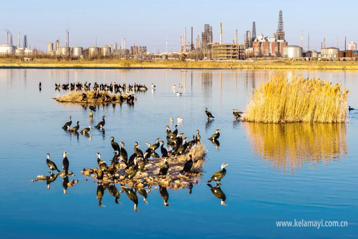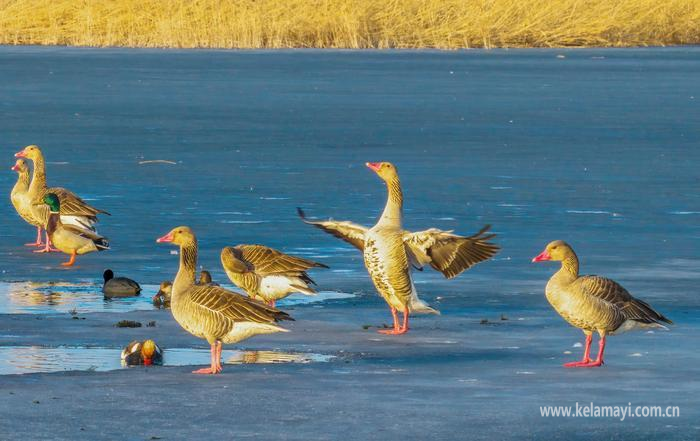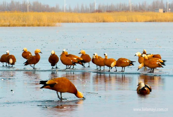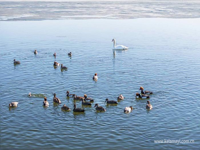 自2月下旬起,绿头鸭、针尾鸭等率先抵达克拉玛依,在市郊芦苇荡深处的冰面与水面间觅食休憩。进入3月,气温持续回暖,赤麻鸭、赤嘴潜鸭、白骨顶鸡等野鸭类种群陆续抵达,红嘴鸥、渔鸥等鸥类振翅翻飞;中大型候鸟白鹭、苍鹭等鹭类静立浅滩,疣鼻天鹅、灰雁悠然游弋,更有野生鸬鹚在滩涂晒太阳,各类候鸟交织成灵动的春日画卷。
