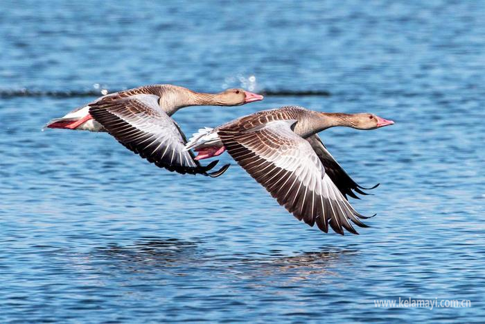 3月24日,克拉玛依天气晴好,空气宜人,两只灰雁伸展翅膀疾驰在古海生态公园(一期)的水面上。张戈平 摄